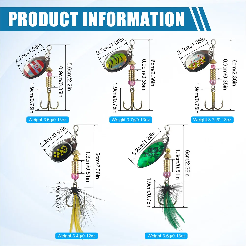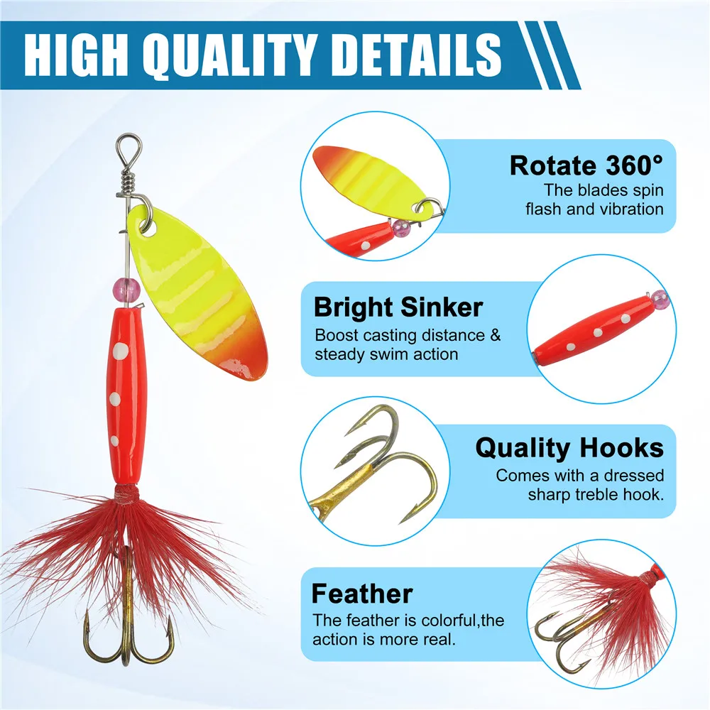 1.Cada señuelo para trucha cuenta con anzuelos triples afilados con mangas brillantes para atractores de golpes para anzuelos seguros y mayor visibilidad.