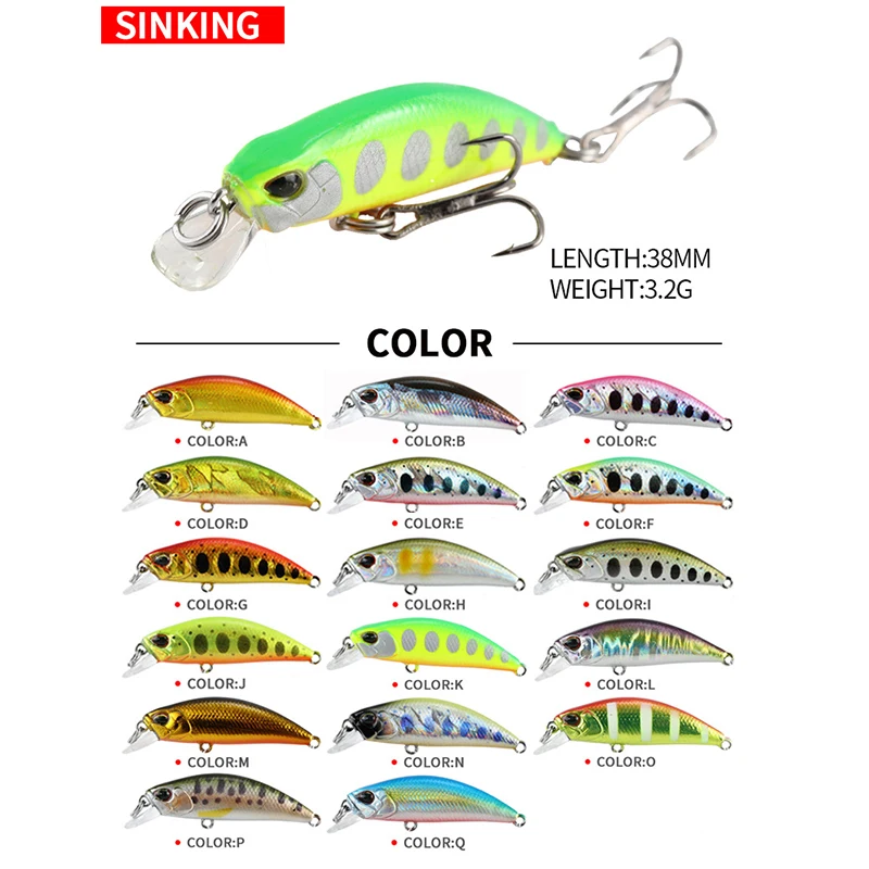 Señuelos de Pesca de hundimiento Minnow, 1 piezas, 38mm, 3,2g, cebo Artificial Mini, Wobbler, CrankBait, trucha, Lucio, lubina, accesorios de pesca