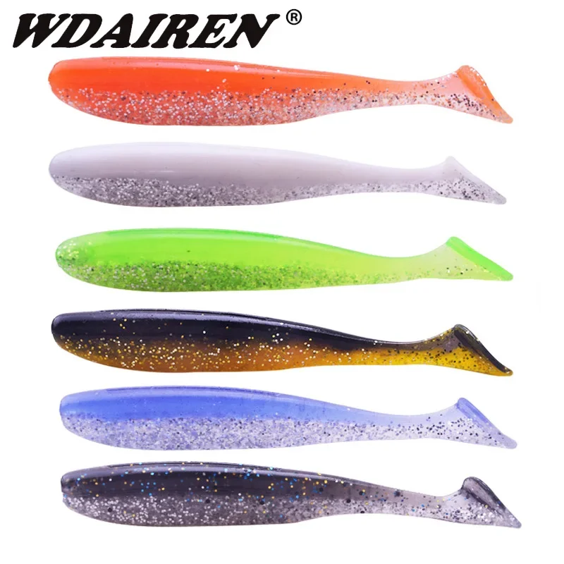 Señuelos de pesca Jig Wobbler, gusano suave, fácil brillo, 8cm, 3,5, cebo Artificial de silicona de doble Color, carpa, lubina, aparejos de natación, 6 uds.