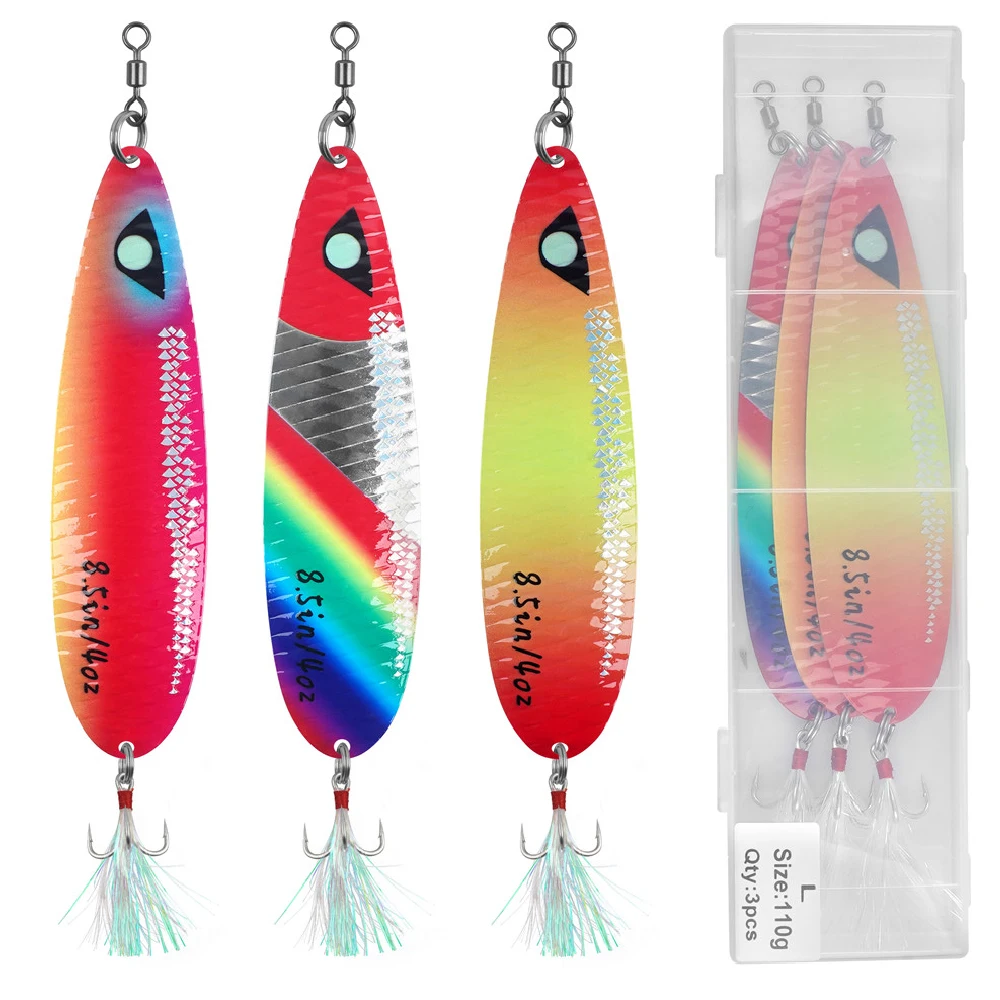 1.Los señuelos de pesca con plantilla de cuchara incluyen una cuchara voladora de sombra verde brillante con anzuelo triple 3/0 súper afilado, anillos giratorios, divididos y cola de flashabú.El tamaño del cebo de la cuchara de agua salada es de 3,5 OZ (90 g) y 4 OZ (110 g) para elegir.Las cucharas están diseñadas para lanzarse, corredearse, sacudir o derraparse.¡Garantizadas que serán las cucharas de pesca más efectivas que jamás uses!
