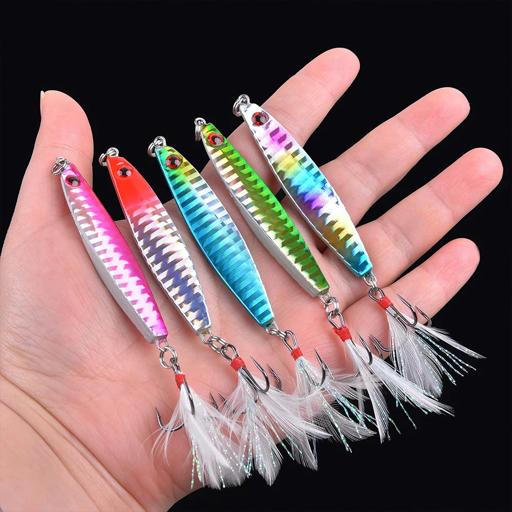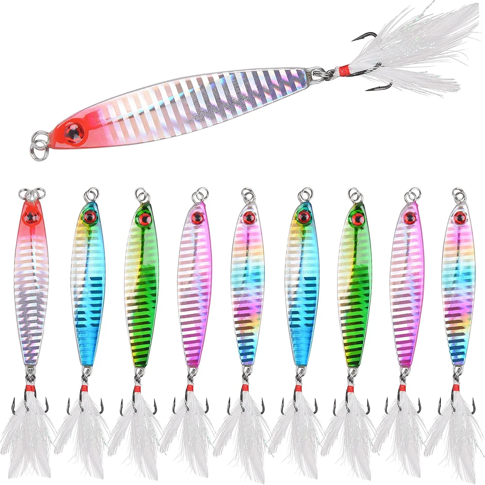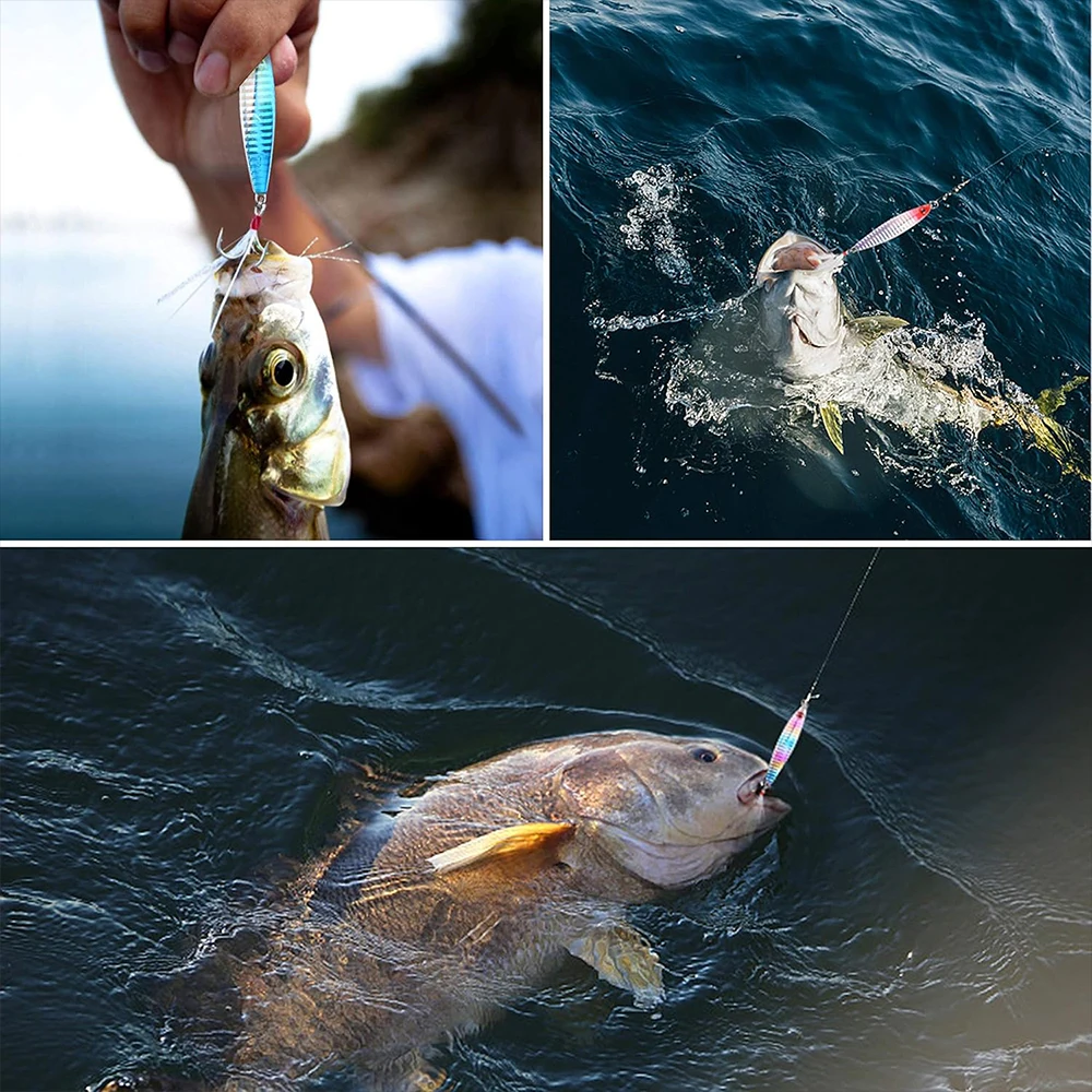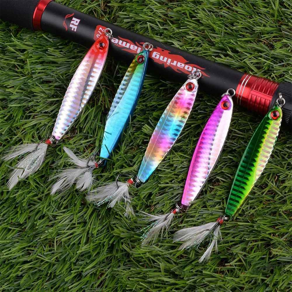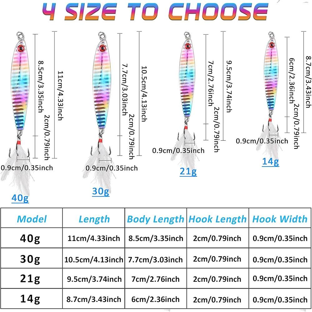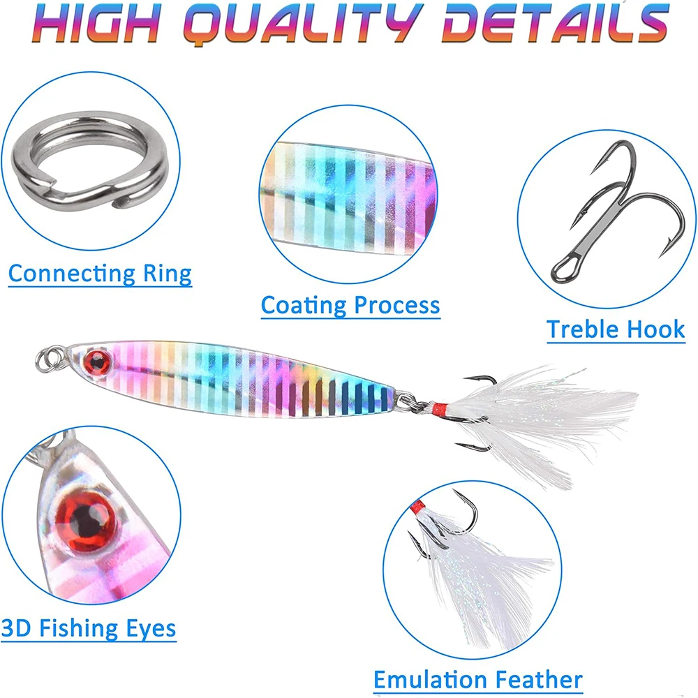GANCHOS TREBLE DE ALTO CARBONO: Los señuelos jigging se presentan con anzuelos triples de plumas súper afilados, lo que permite a esta plantilla un verdadero imán para los peces. Con un revestimiento adicional de resistencia a la corrosión para resistir el abuso del agua salada.