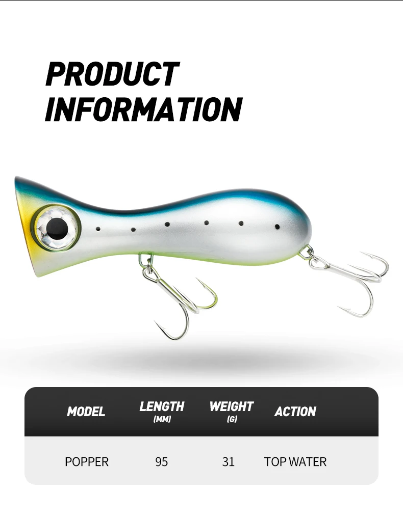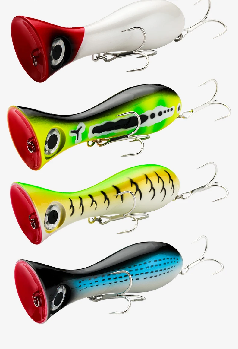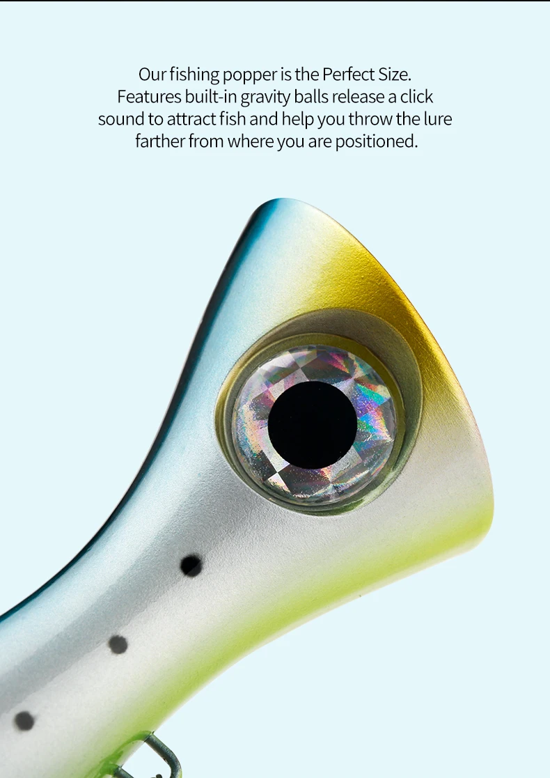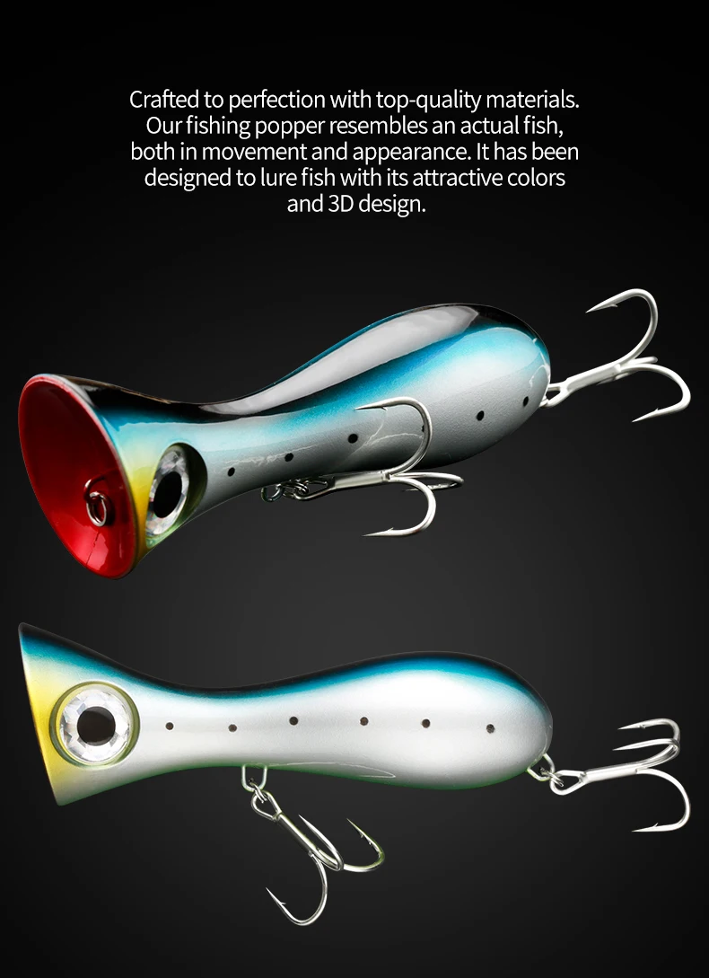 Los cebos popper están elaborados con una punta cóncava ancha, crean un sonido burbujeante mucho más profundo y una acción de estallido más agresiva, imitan perfectamente un pez cebo luchador en la superficie y ayudan a desencadenar más picaduras.
