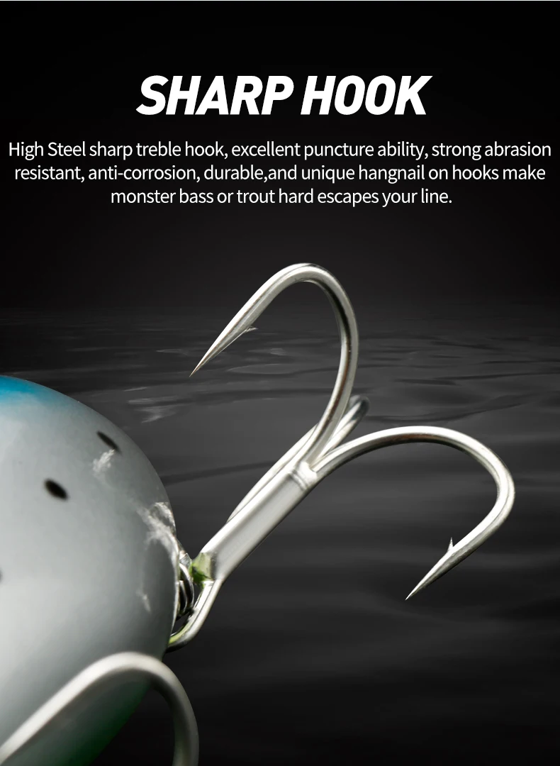 【GANCHO AFILADO】El anzuelo triple afilado de acero alto, excelente capacidad de punción, fuerte resistencia a la abrasión, anticorrosión, duradero y un adorno único en los ganchos hacen que el monstruo lubina o la trucha escape duro de su línea.