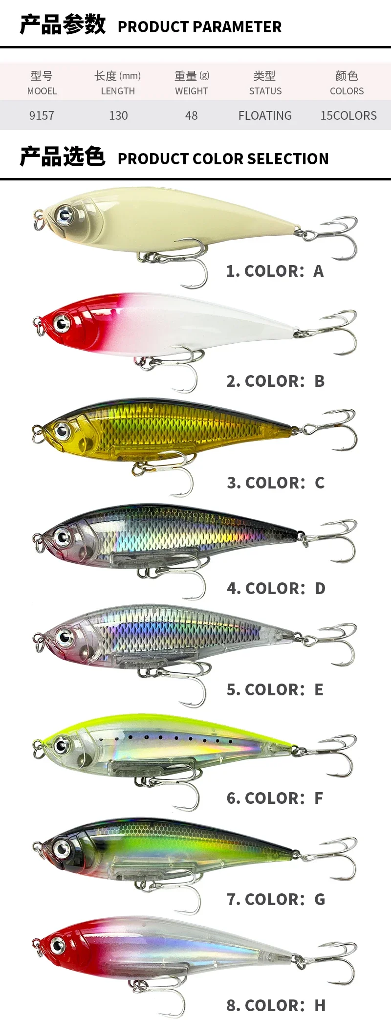 Especificaciones: Material: Plástico ABS de alta calidad Peso: 48 g Longitud: 130 mm Diseño: Forma de lápiz flotante con una acción oscilante realista Especie objetivo: Ideal para truchas de agua salada y otros peces de caza costeros Durabilidad: Construido para soportar los rigores de la pesca en agua salada Características: Señuelos de pesca **Ingenía de precisión para pescadores** El señuelo de pesca con lápiz flotante de 30 g y 110 mm es un testimonio de la ingeniería de precisión, diseñado para atraer incluso a los peces de caza Su diseño flotante garantiza que se mantenga a flote en la superficie del agua, lo que lo convierte en una excelente opción para la pesca costera. La acción oscilante del señuelo se logra mediante un sistema de transferencia de peso interno meticulosamente elaborado, que imita el movimiento natural de la presa, asegurando una presentación realista difícil de resistir para los peces. **Versátil y eficaz** Este señuelo versátil no es sólo una herramienta para el pescador experimentado; Es un compañero confiable tanto para principiantes como para veteranos. Su construcción de agua salada lo hace adecuado para su uso en una variedad de escenarios de pesca, desde las baias tranquilas hasta el océano abierto. Ya sea que esté dirigido a truchas en aguas costeras o buscando peces de caza más grandes, la durabilidad y eficacia de este señuelo le servirán bien. Su tamaño y peso están perfectamente equilibrados para garantizar una experiencia de lanzamiento suave, permitiéndole cubrir más agua y aumentar sus posibilidades de lograr una captura exitosa. **Adaptable y confiable** El señuelo de pesca con lápiz flotante de 30 g y 110 mm no es solo un señuelo; Es una herramienta que se adapta a tu estilo de pesca. Si eres un entusiasta de los cebos o prefieres una recuperación más tradicional, la versatilidad de este señuelo brilla. Su apariencia realista y su movimiento errático lo convierten en un objetivo irresistible para una amplia gama de peces de caza de agua salada. Con su diseño robusto y rendimiento confiable, este señuelo es un complemento esencial para la colección de equipos de pesca de cualquier pescador.