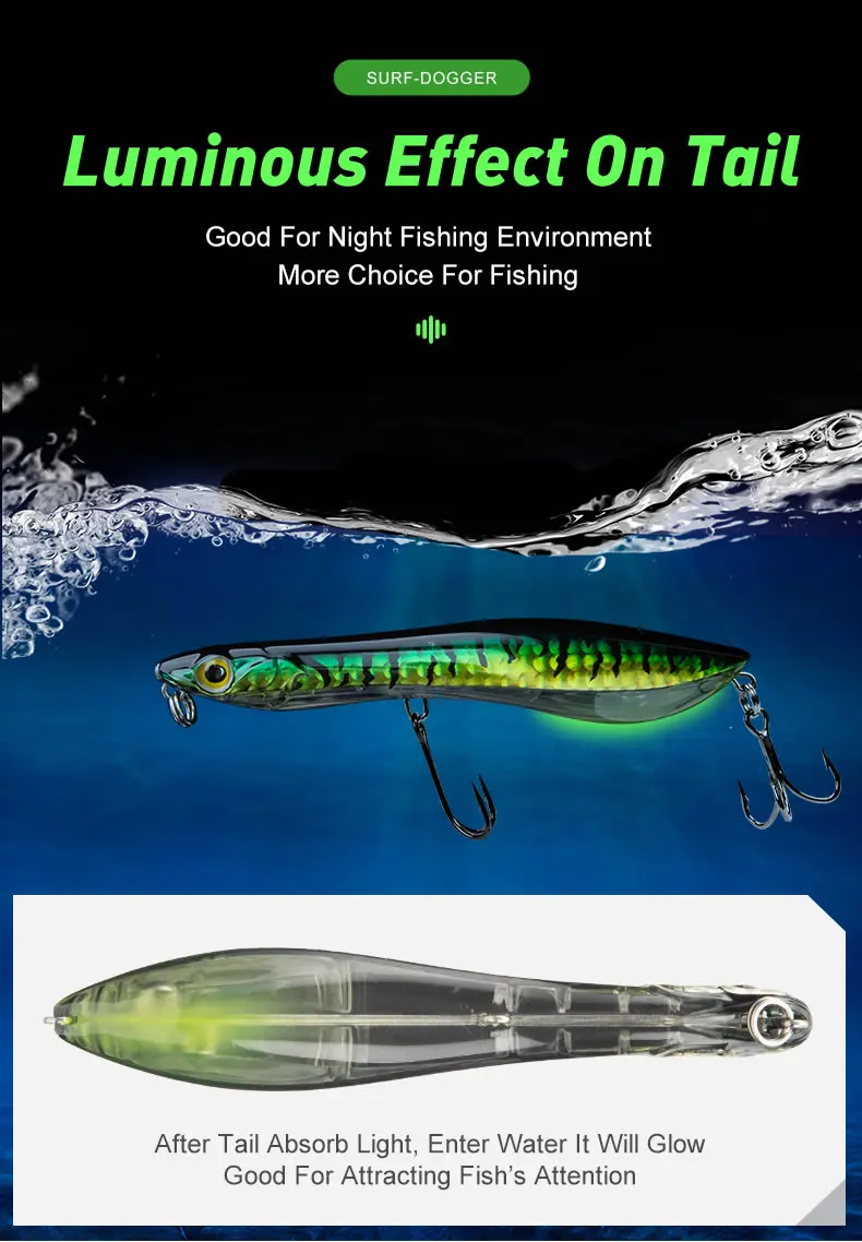 Equipado con una cola luminosa, este señuelo destaca en la pesca nocturna, ofreciendo más visibilidad y elección.