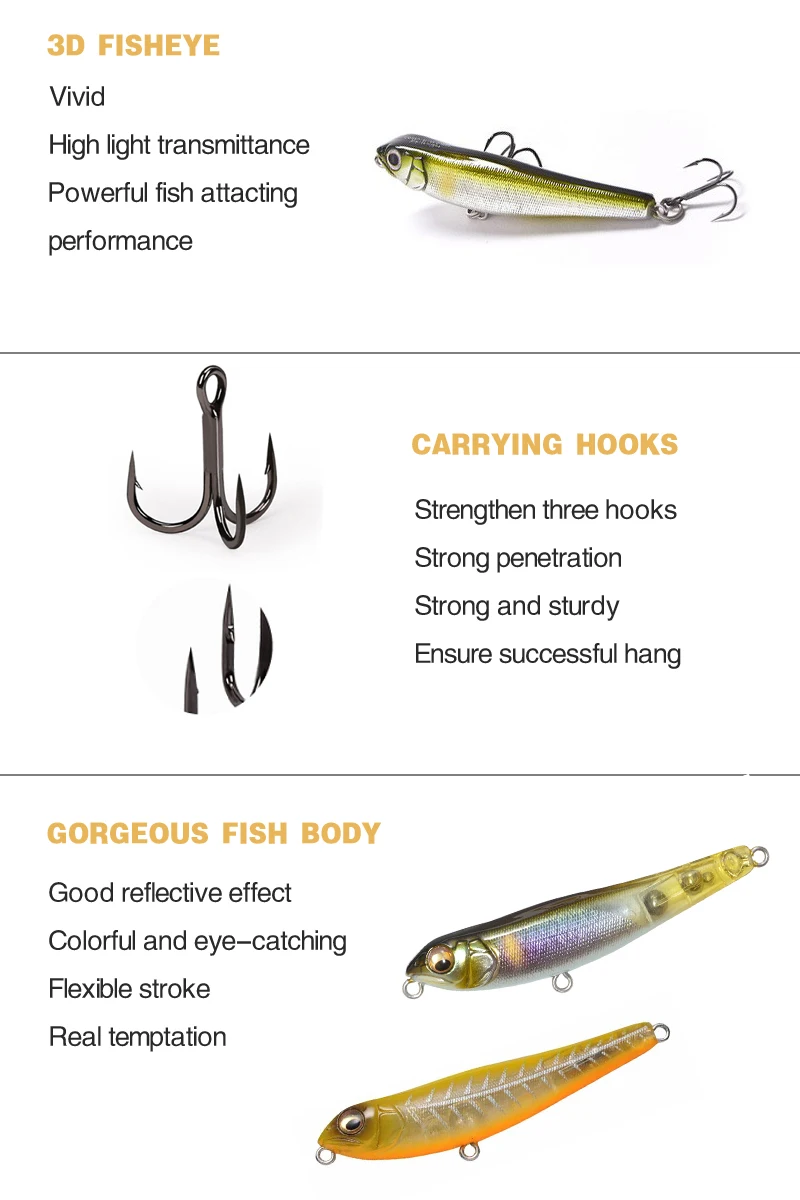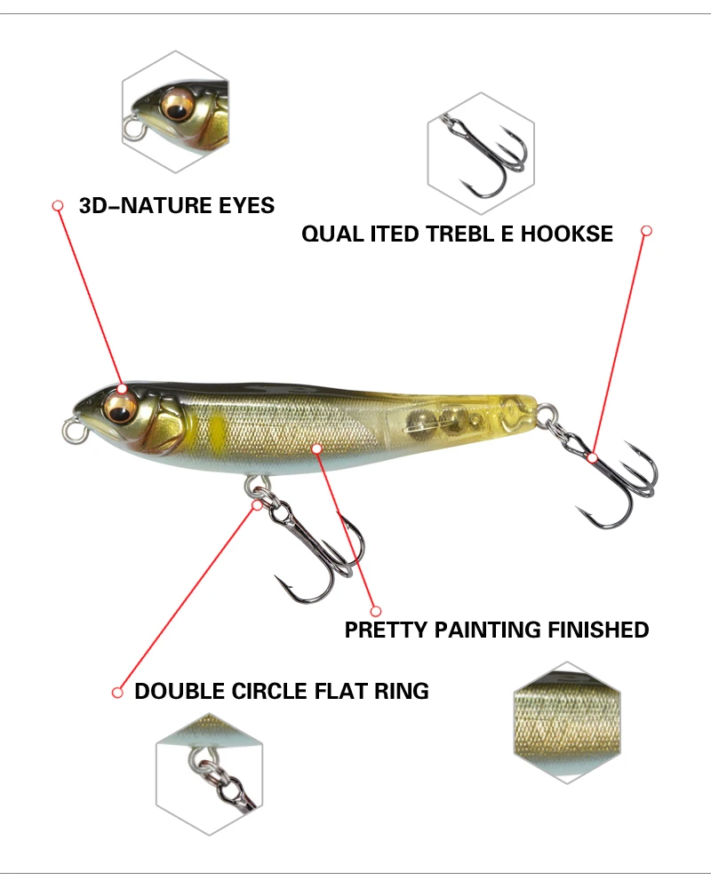 5. Está ABS hecho de material plástico, resistente y resistente, resistente a caídas y percusión. Las bolas de acero utilizadas en el interior han sido probadas con instrumentos de precisión para garantizar el estilo de natación de cada cebo.