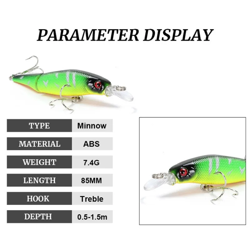 Los ojos 3D lo convierten en una herramienta perfecta para los amantes de la pesca.El cuerpo colorido puede facilitar la captura de peces.Acción realista y rápida en el agua.Excelente efecto visual para atraer peces.Detalles del producto:Marca: FISHINAPOTTipo: señuelo de pesca MinnowPeso: 7,4GLongitud: 8,5 cmColor: 8 colores diferentes
