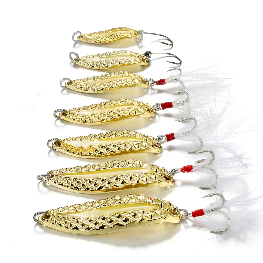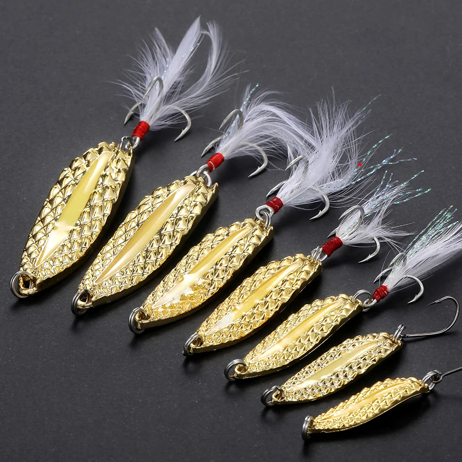 Señuelos de Pesca luminosos de Metal, 1 piezas, 2,5g-20g, Spinner de lentejuelas con pluma, anzuelo triple