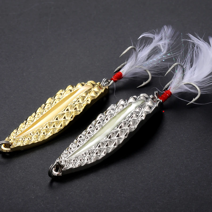Señuelos de Pesca luminosos de Metal, 1 piezas, 2,5g-20g, Spinner de lentejuelas con pluma, anzuelo triple