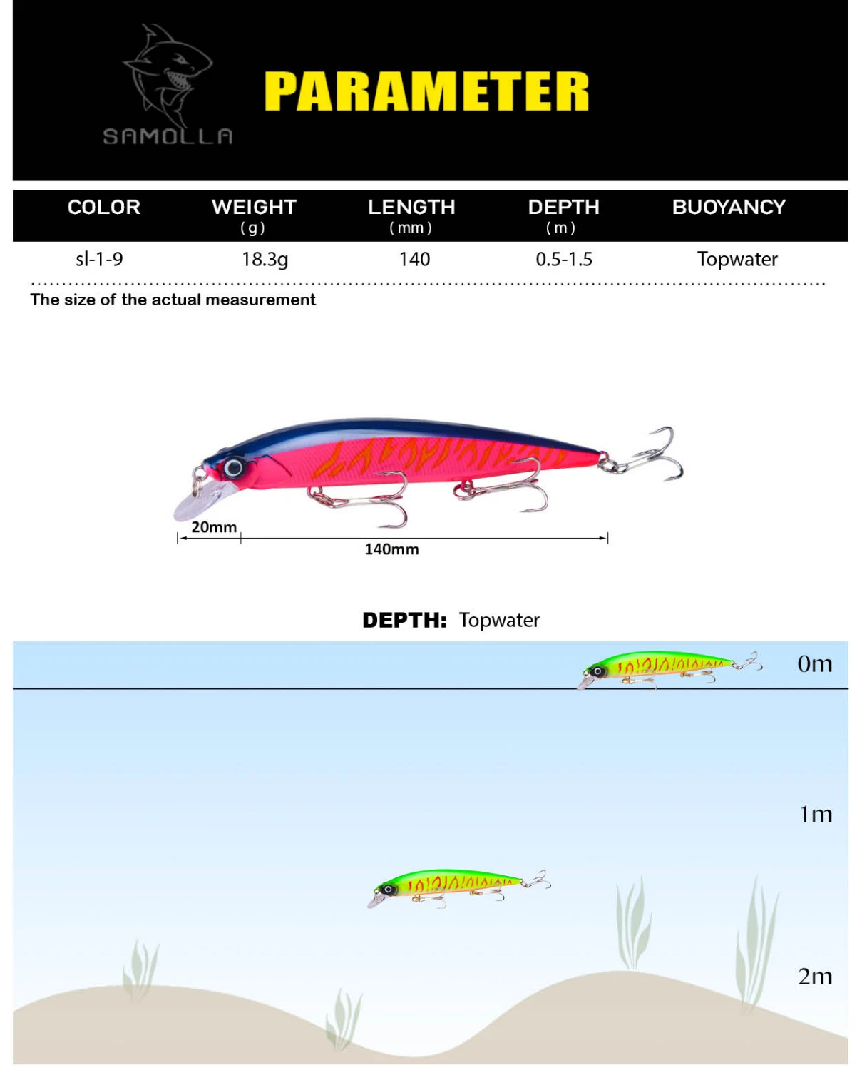 Detalles del producto: Marca: SAMOLLA Modelo de señuelo: Minnow Tipo de señuelo: señuelo de pesca duro Peso del señuelo: 18,3G Longitud del señuelo: 140mm Profundidad de buceo: 0,5-1,5 M Flotabilidad: Topwater Ganchos: equipados con ganchos anticorrosión. Ojos: ojos de pez 3D Anillos: tres Colores: 9 colores