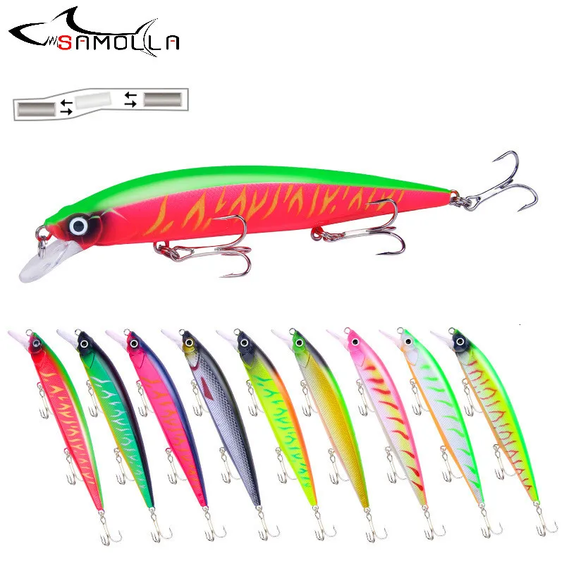 Detalles del producto: Marca: SAMOLLA Modelo de señuelo: Minnow Tipo de señuelo: señuelo de pesca duro Peso del señuelo: 18,3G Longitud del señuelo: 140mm Profundidad de buceo: 0,5-1,5 M Flotabilidad: Topwater Ganchos: equipados con ganchos anticorrosión. Ojos: ojos de pez 3D Anillos: tres Colores: 9 colores