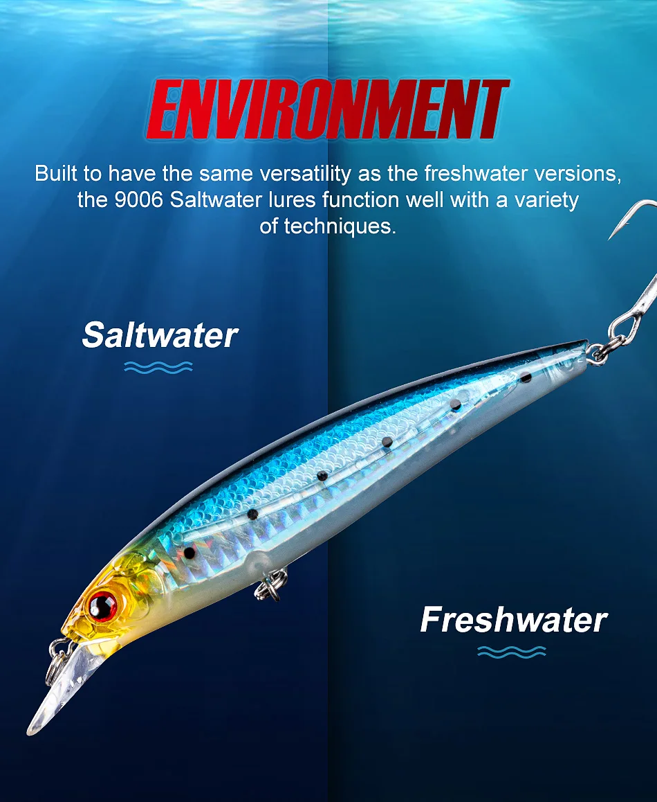 Construidos para tener la misma versatilidad que las versiones de agua dulce, los señuelos de agua salada 9006 funcionan bien con una variedad de técnicas.