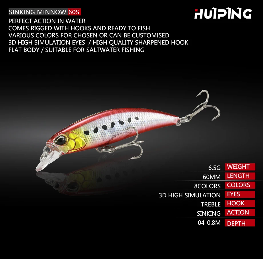 Hundimiento Pesca Minnow 60mm 6,5G Wobbler Pesca Lucio Trucha Señuelo Cebo duro Isca Aparejos de pesca artificiales Accesorios