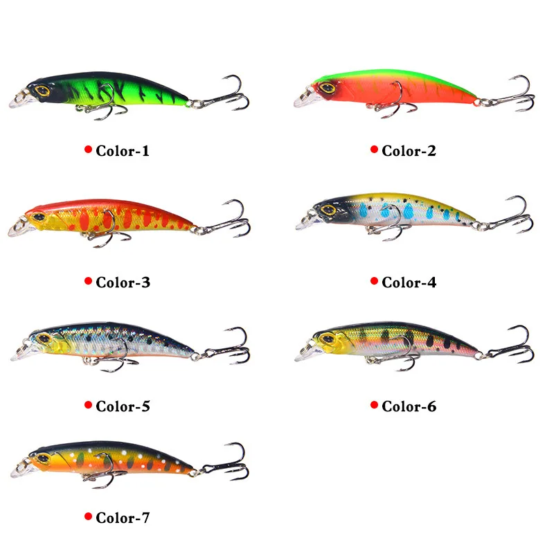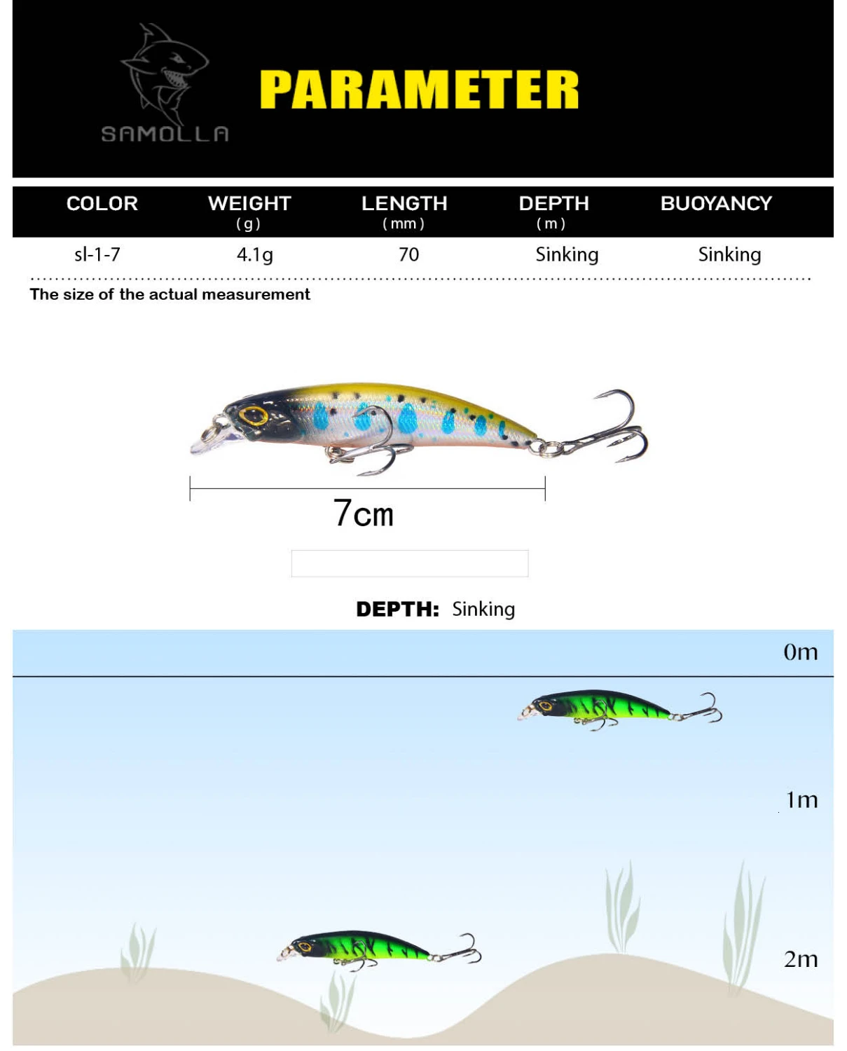 Detalles del producto: Marca: SAMOLLA Modelo de señuelo: Minnow Tipo de señuelo: señuelo de pesca duro Peso del señuelo: 4,1G Longitud del señuelo: 70mm Profundidad de buceo: Flotabilidad: hundimiento de superficie Ganchos: Equipado con ganchos anticorrosión de Ojos: ojos de pez 3D Anillos: bicíclicos Colores: 7 colores
