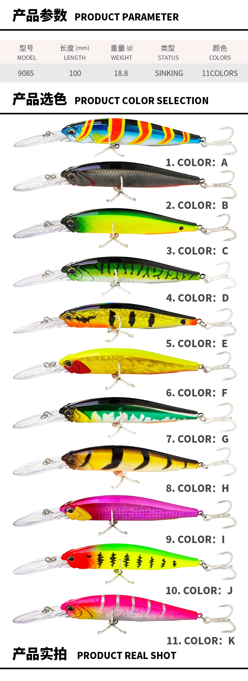 * ES UN LÁPIZ DE HUNDIMIENTO DE PLACA DE LENGUA CORTA FÁCIL DE OPERAR, EL TODO ES AFORMADO, CON UN BUEN RENDIMIENTO DE LARGO ALCANCE, INCLUSO EN EL CASO DE VENTAJA PUEDE MANTENER UNA BUENA DISTANCIA DE VUEDA, EL CUERPO DE CEBO PUEDE NADAR POR DEBAJO DE LA SUPERFICIE DEL AGUA A ALTA VELOCIDAD, Cuando la línea se detiene, puede lograr la acción de hundimiento natural del rollo oscilante, atraer la mordedura del pez objetivo.