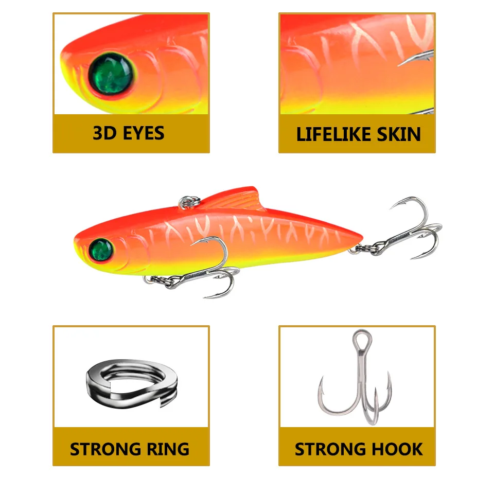 Los ojos 3D lo convierten en una herramienta perfecta para los amantes de la pesca.El cuerpo colorido puede facilitar la captura de peces.Acción realista y rápida en el agua.Excelente efecto visual de atraer peces.Detalles del productoMarca: POETRYYITipo: señuelo de pesca VIBPeso: 21GLongitud: 8,5 CMColor: 5 colores diferentes