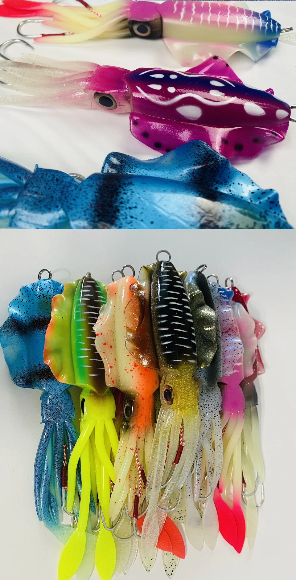6. El diseño más nuevo que incluye una plomada dentro del señuelo de calamar y 4/0 ganchos de asistencia doble compensados. Agregue una plomada de 40g En el calamar, reemplace una adición a una plantilla o simplemente agregue una cabeza de plantilla.