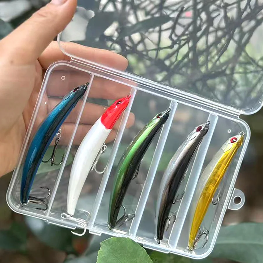 Señuelos de Pesca de plástico duro, cebos artificiales falsos para pesca de pececillos, Wobblers para curricán, Lucio, trucha, Topwater, 5 unids/lote por caja