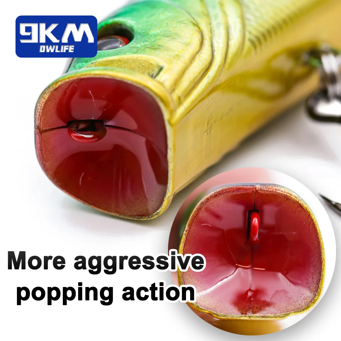 El popper de forma clásica con un nuevo diseño de boca de copa brindará una acción de estallido mucho más agresiva para desencadenar más mordeduras.La boca de la taza y las bolas de acero generarán un fuerte chirrido y crujido para llamar a los peces desde la profundidad.