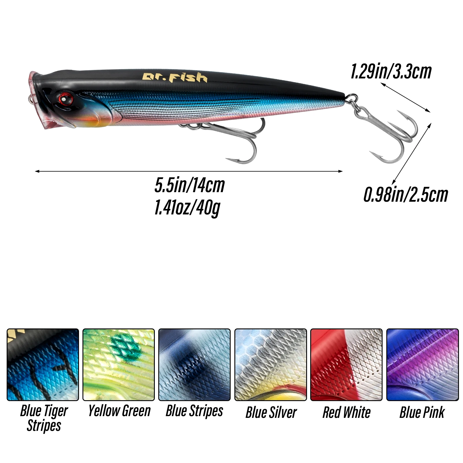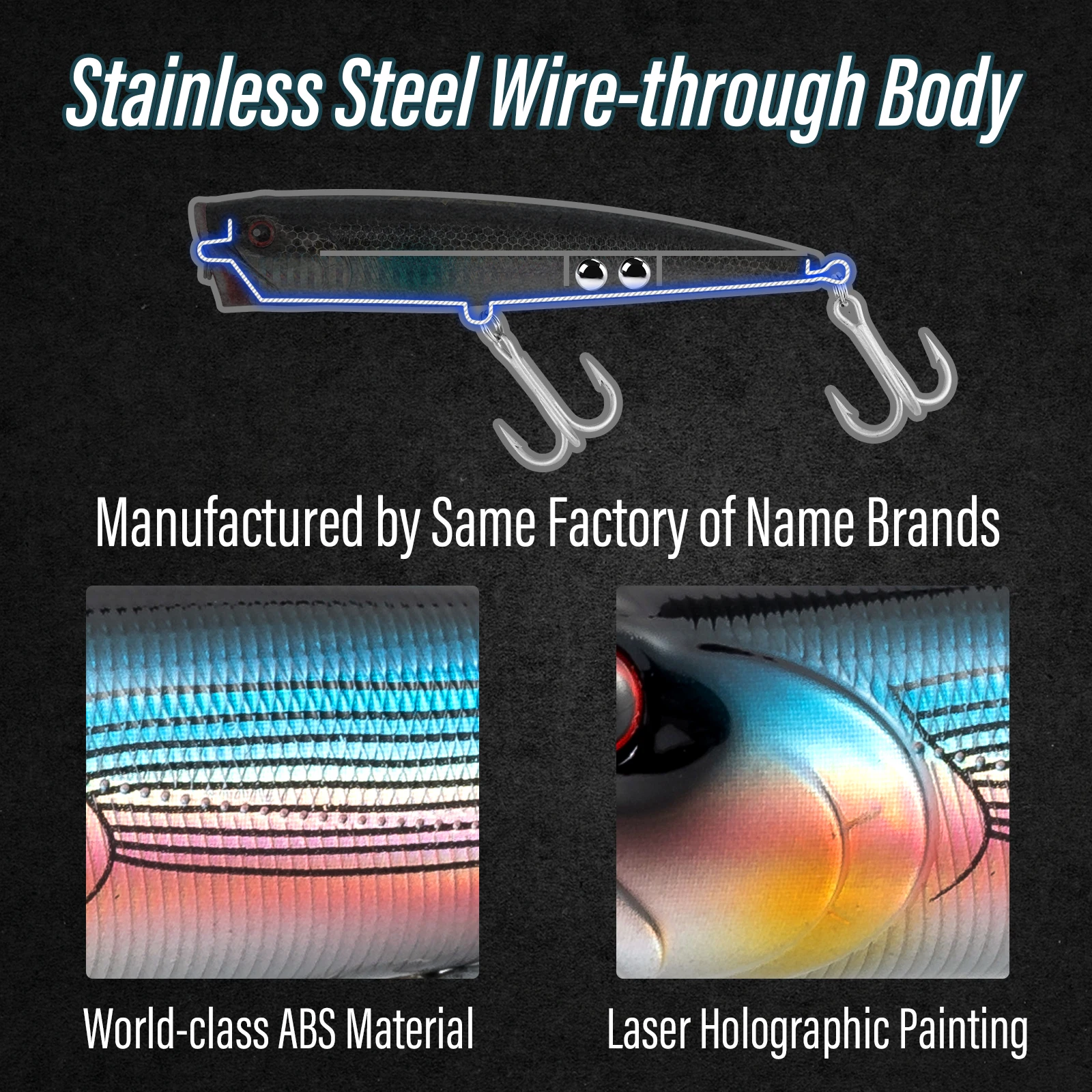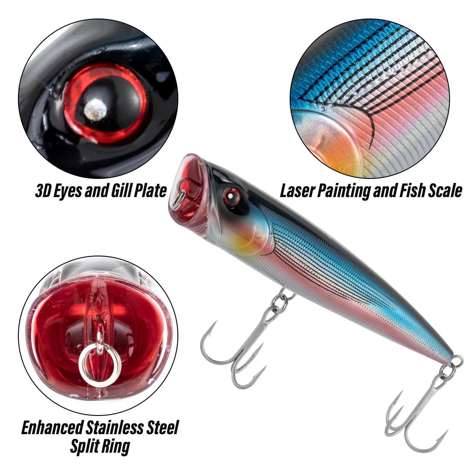 El Popper de forma clásica con un nuevo diseño de boca de copa ofrecerá una acción de estallido mucho más agresiva para provocar más picaduras. La boca de la copa y las bolas de acero generarán un fuerte gorgoteo y traqueteo para llamar a los peces desde la profundidad.