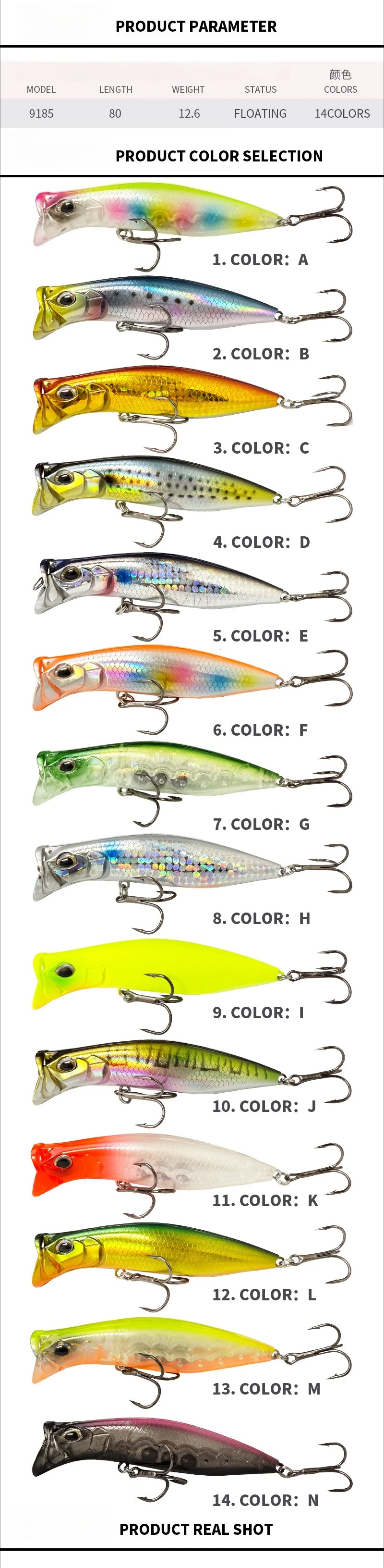 Característica del producto:1.Se realizó un sorprendente rendimiento de vuelo y natación moviendo el centro de gravedad de 3 bolas grandes.2.La generosa estructura de flotabilidad y la forma de los labios brindan al cebo una excelente capacidad para evitar el enraizamiento y un poder de mantenimiento del alcance.3.Cambia la forma de la cola, puedes obtener una actitud de vuelo estable y explorar el surf más ampliamente.4.El cebo presenta una fuerte acción rodante.Tiene un rendimiento de lanzamiento a larga distancia y un alto atractivo, por lo que es un señuelo que desea utilizar al explorar una amplia gama.Detalle del producto:1.Tipo: señuelo de pesca Popper flotante2.Peso: 12,6 g3.Longitud: 80 mm 3,15 pulgadas4.Rango: 80-150 cm5.Color: 146.Paquete: 1 Uds.Característica del producto: 1.Se realizó un sorprendente rendimiento de vuelo y natación moviendo el centro de gravedad de 3 bolas grandes. 2.La generosa estructura de flotabilidad y la forma de los labios brindan al cebo una excelente capacidad para evitar el enraizamiento y un poder de mantenimiento del alcance. 3.Cambia la forma de la cola, puedes obtener una actitud de vuelo estable y explorar el surf más ampliamente. 4.El cebo presenta una fuerte acción rodante.Tiene un rendimiento de lanzamiento a larga distancia y un alto atractivo, por lo que es un señuelo que desea utilizar al explorar una amplia gama. Detalle del producto: 1.Tipo: señuelo de pesca Popper flotante 2.Peso: 12,6 g 3.Longitud: 80 mm 3,15 pulgadas 4.Rango: 80-150 cm 5.Color: 14 6. Paquete: 1 Uds.