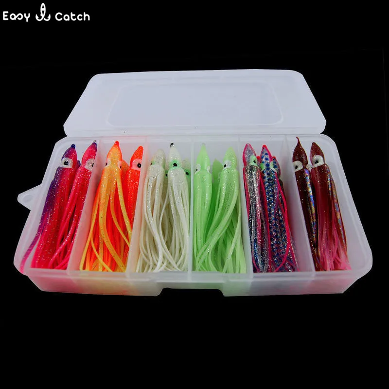 Señuelos de pesca de pulpo de plástico blando de 9cm, juego de señuelos de faldas de calamar artificiales luminosas de silicona de colores mezclados con caja, 24 Uds.