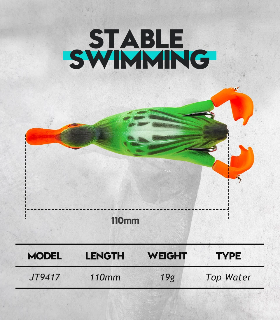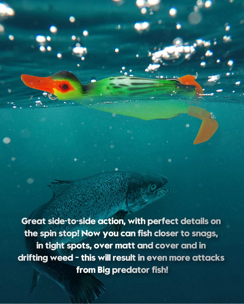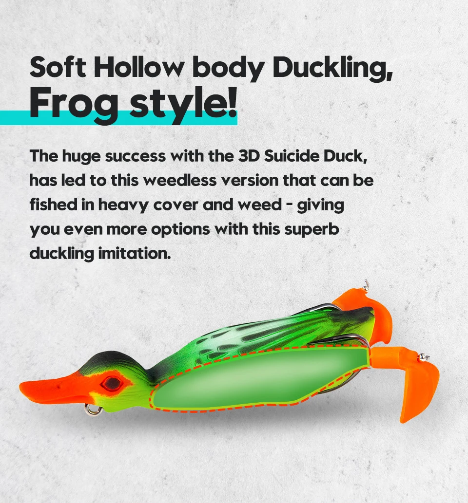 1. Patito de cuerpo hueco suave, estilo rana. El gran éxito con el pato suicida 3D, ha llevado a esta versión weedless que se puede pescar con cubierta pesada y malezas, dándote aún más opciones con esta magnífica imitación de patito.