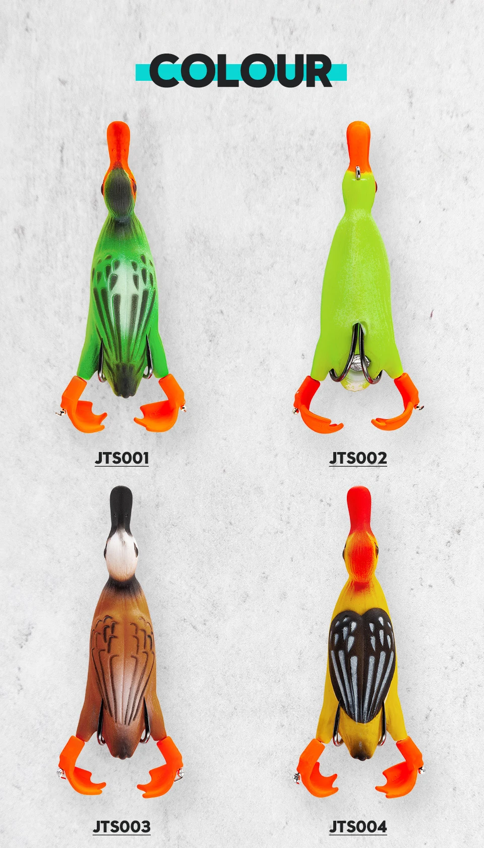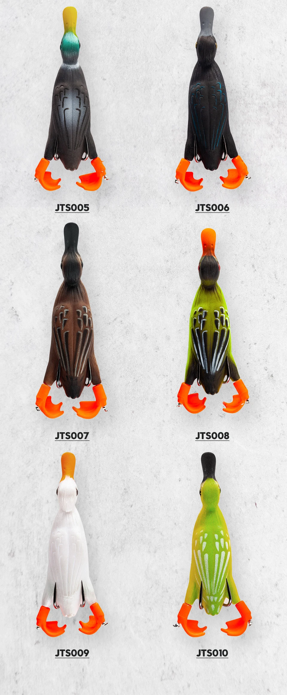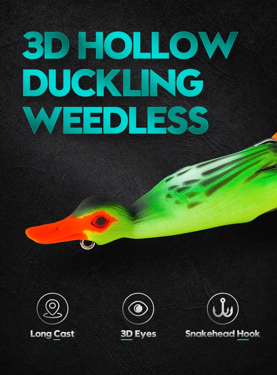 1. Patito de cuerpo hueco suave, estilo rana. El gran éxito con el pato suicida 3D, ha llevado a esta versión weedless que se puede pescar con cubierta pesada y malezas, dándote aún más opciones con esta magnífica imitación de patito.