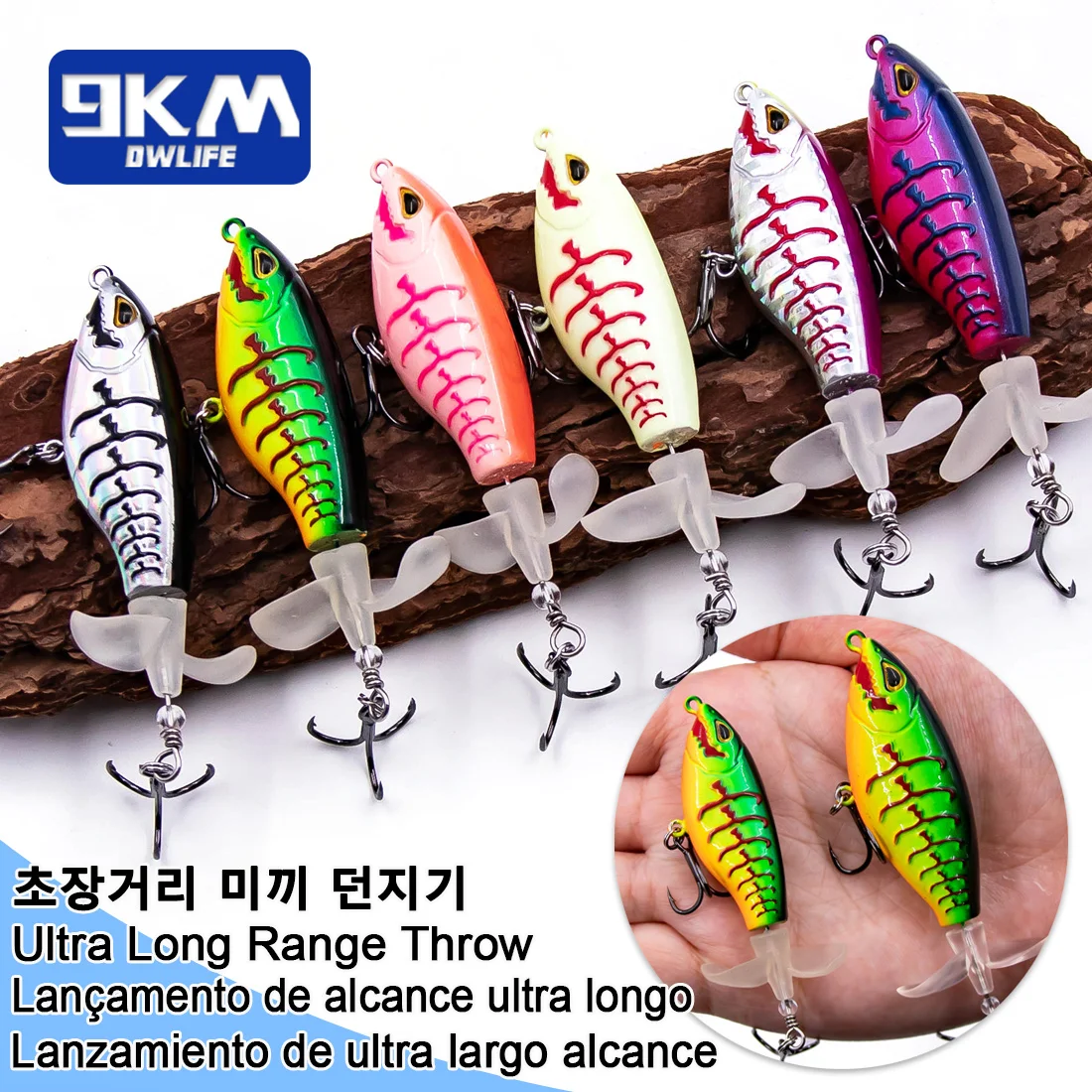 ENORME SOPORTE DE AGUA SUPERIOR: la pesca con cebo para lubina tiene un peso adicional en el vientre, controla el baricentro fácilmente y hace que ejecute una distancia de lanzamiento más lejana sin esfuerzo.Cuando recuperas el cebo de forma rápida y constante, la cola giratoria girará y emitirá salpicaduras de agua.¡Es realmente difícil que el bajo resista el señuelo!