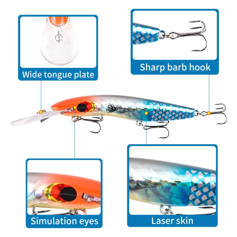 4. Durable and Resilient Construction: Crafted from high-quality materials, the Big Minnow Vivid Fishing Lures are built to withstand the rigors of fishing. Their durable and resilient construction ensures they can endure strikes, collisions with underwater structures, and the aggressive behavior of predatory fish, maintaining their effectiveness over time.