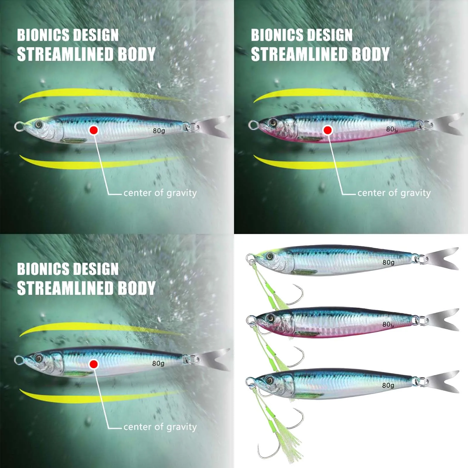 Rendimiento superior de fundición: Estos señuelos largos de placa de hierro fundido están diseñados para un hundimiento rápido y una distancia de lanzamiento excepcional, lo que los hace perfectos para alcanzar peces lejanos.