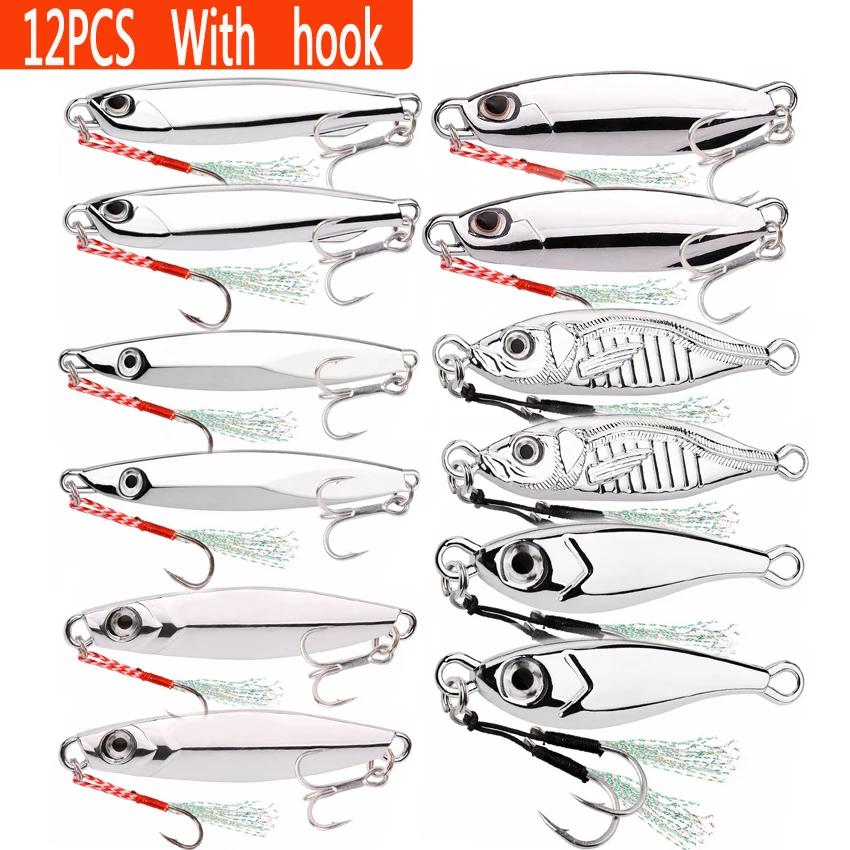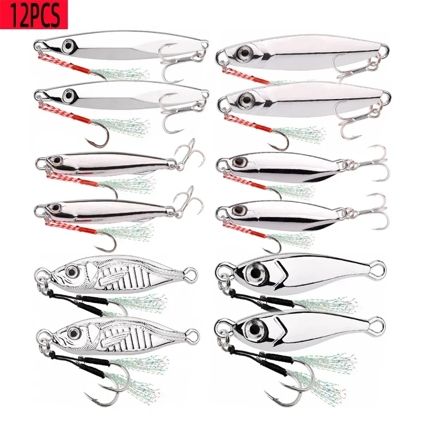 Señuelos de plantilla de Metal plateado, cebo de Pesca de Mar, juego de aparejos de lubina de agua salada, chapado mixto, 10g, 15g, 20g, 30g, 40g, 12 unidades por lote