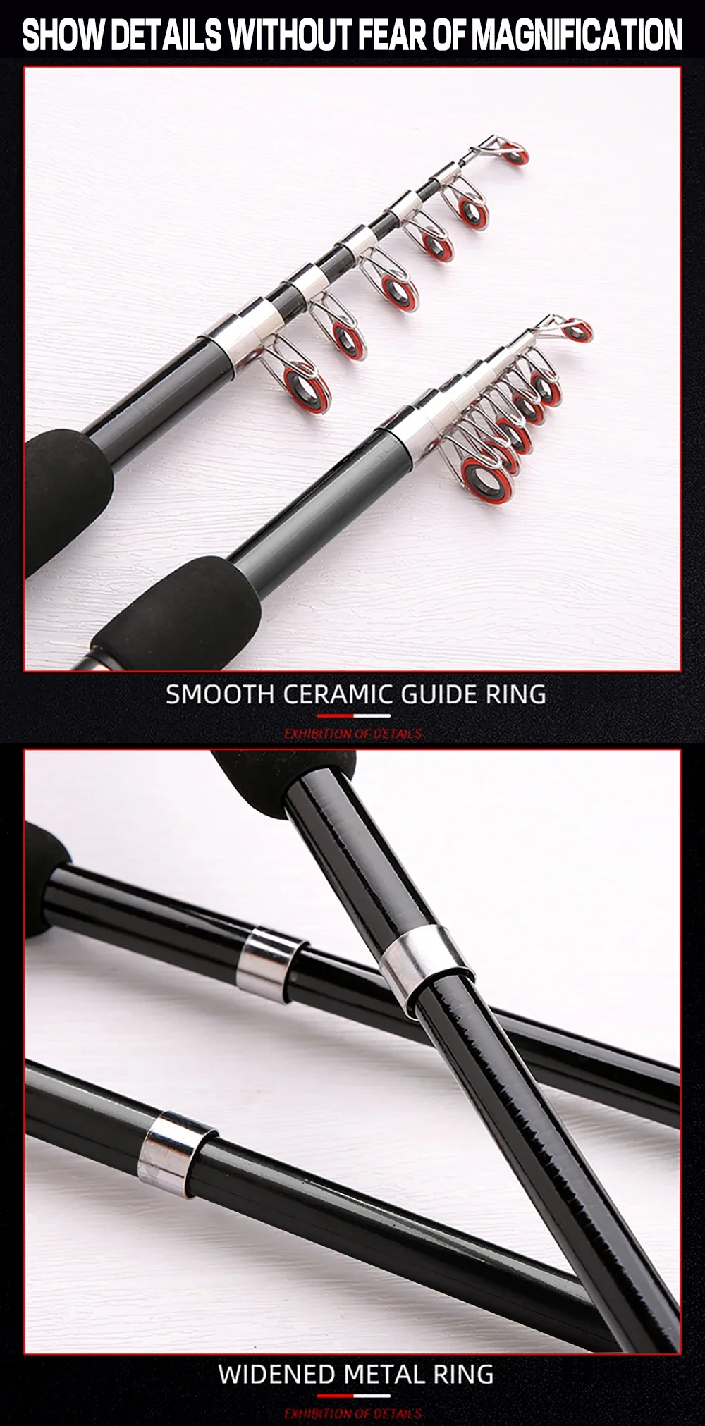 También hemos reforzado la punta con un núcleo sólido más grueso, lo que añade resistencia y durabilidad adicionales. El anillo de refuerzo de metal garantiza que la caña permanezca intacta incluso durante intensas batallas con peces grandes. Cuando esté listo para empacar, simplemente doble la caña y guárdela fácilmente en su caja de aparejos, gracias a su impresionante longitud de 38cm plegada.