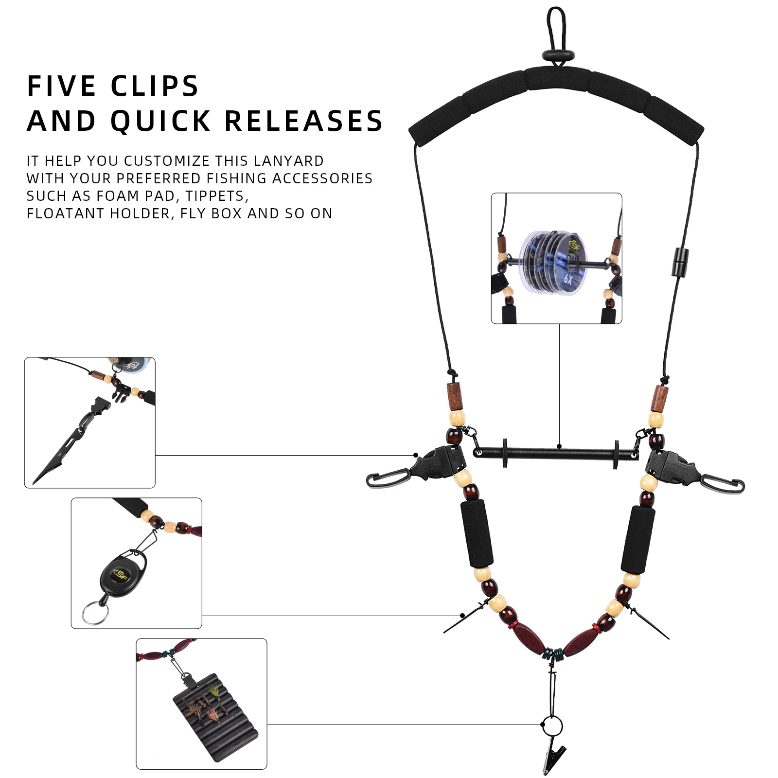 Cordón personalizado: la barra tippet horizontal tiene suficiente espacio para acomodar otras herramientas de pesca pequeñas además de tippets. Cinco clips y liberación rápida le ayudan a personalizar este cordón con sus accesorios de pesca preferidos, como almohadilla de espuma, tippets, soporte flotante, caja de moscas, etc., cuando río abajo o de viaje. Ayuda a optimizar el almacenamiento de herramientas de pesca con mosca y la eficiencia del flujo de trabajo.