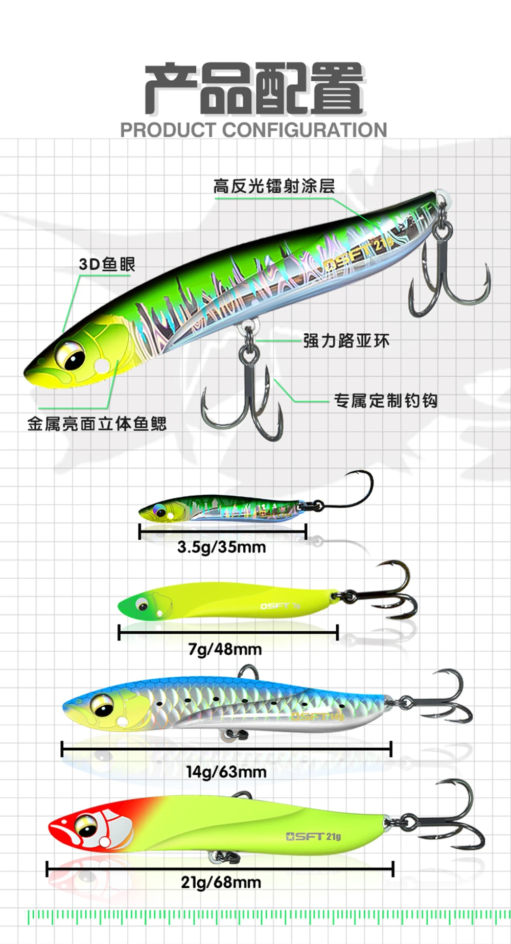 Tamaño 3,5 g use un solo gancho, tamaño 7 g / 14 g / 21 g use un anzuelo triple