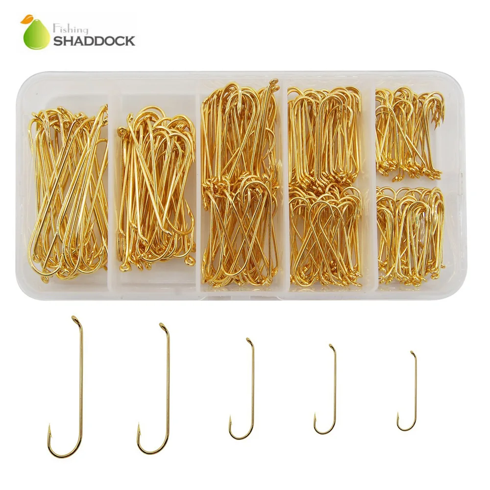 Shaddock pesca 300 piezas/caja ganchos de mosca dorada serpentina de caña larga atado de mosca ganchos de pesca conjunto con caja