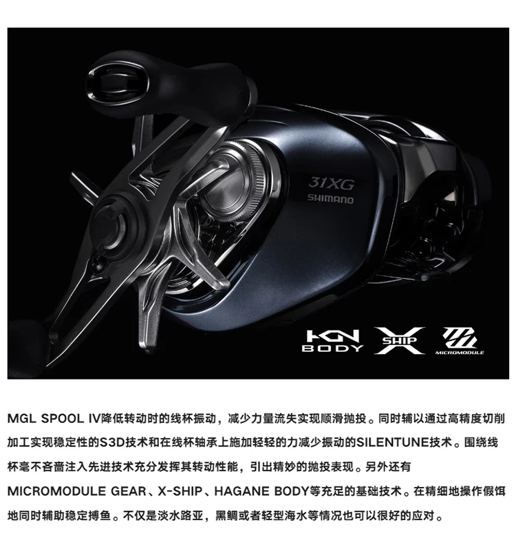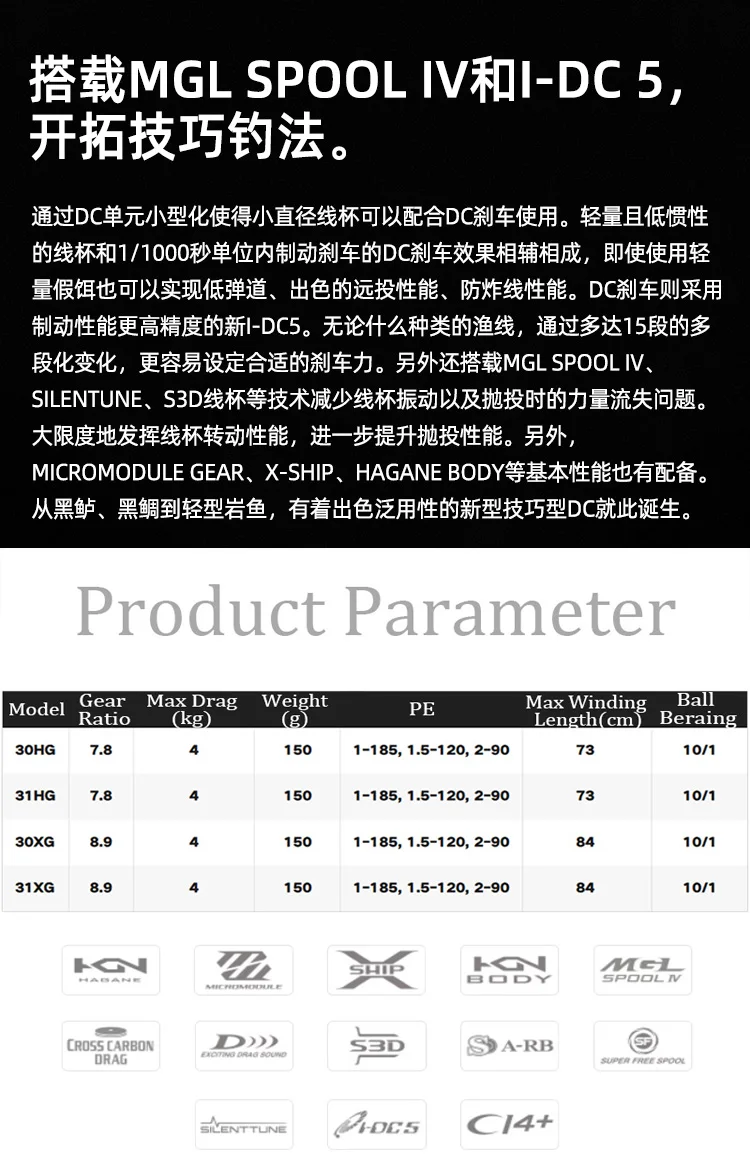 La unidad DC está miniaturizada, por lo que se pueden utilizar carretes de pequeño diámetro con frenos de CC. Se puede lograr el carrete liviano y de baja inercia y el efecto de freno de CC del freno de unidad de 1/1000 segundos, e incluso con señuelos livianos, baja trayectoria, excelente rendimiento de lanzamiento a larga distancia y rendimiento anti-explosión de línea.. El freno de CC adopta el nuevo I-DC5 con mayor precisión de frenado. No importa qué tipo de hilo de pescar, es más fácil establecer la fuerza de frenado adecuada mediante cambios de varias etapas de hasta 15 etapas. Además, el carrete MGL SPOOL IV, SILENTUNE, S3D y otras tecnologías están equipados para reducir la vibración del carrete y la pérdida de potencia durante el lanzamiento. El rendimiento de rotación del carrete se maximiza para mejorar aún más el rendimiento del lanzamiento. Además, también se incluyen funciones básicas como MICROMODULE GEAR, X-SHIP y HAGANE BODY. Desde lubina negra, dorada de mar negra hasta pez roca claro, nace un nuevo tipo de CC técnico con excelente versatilidad.