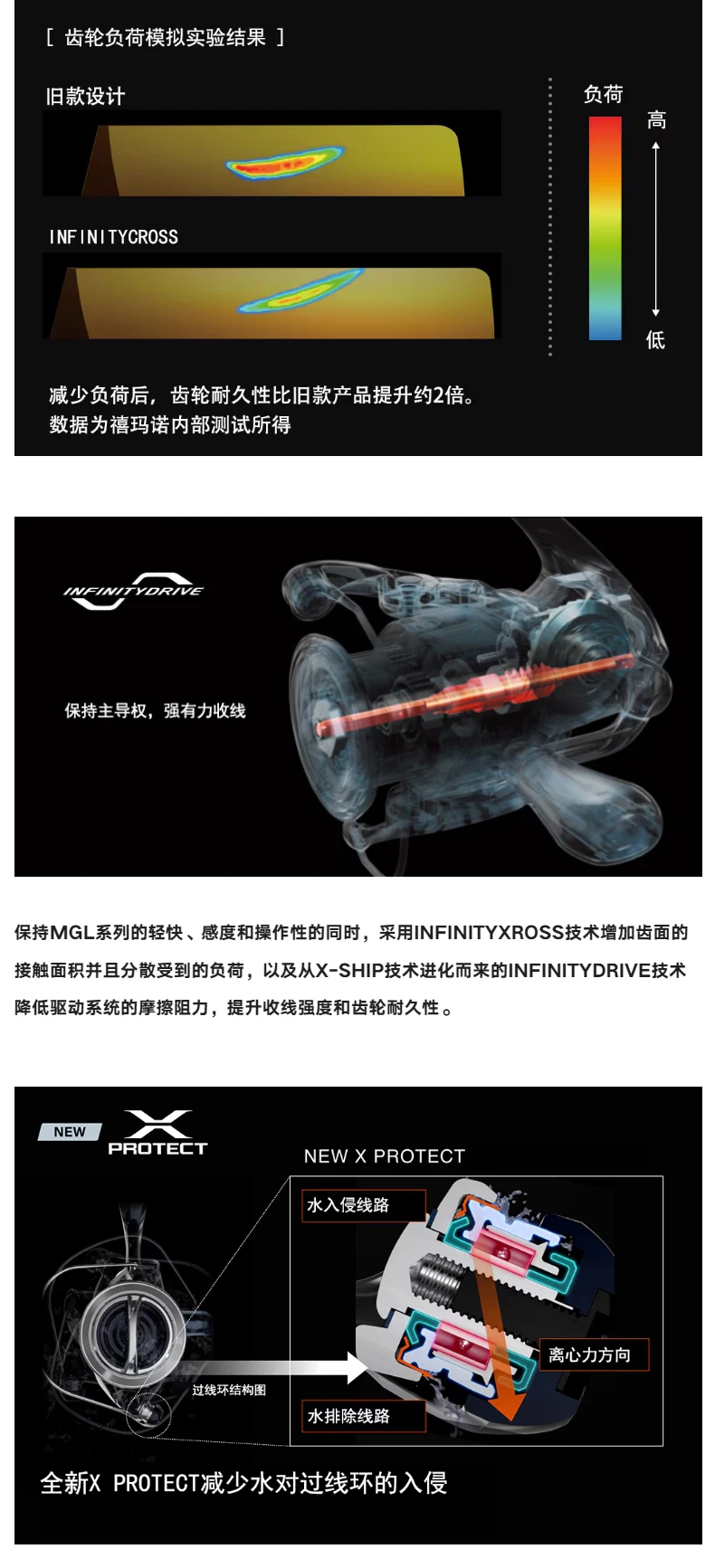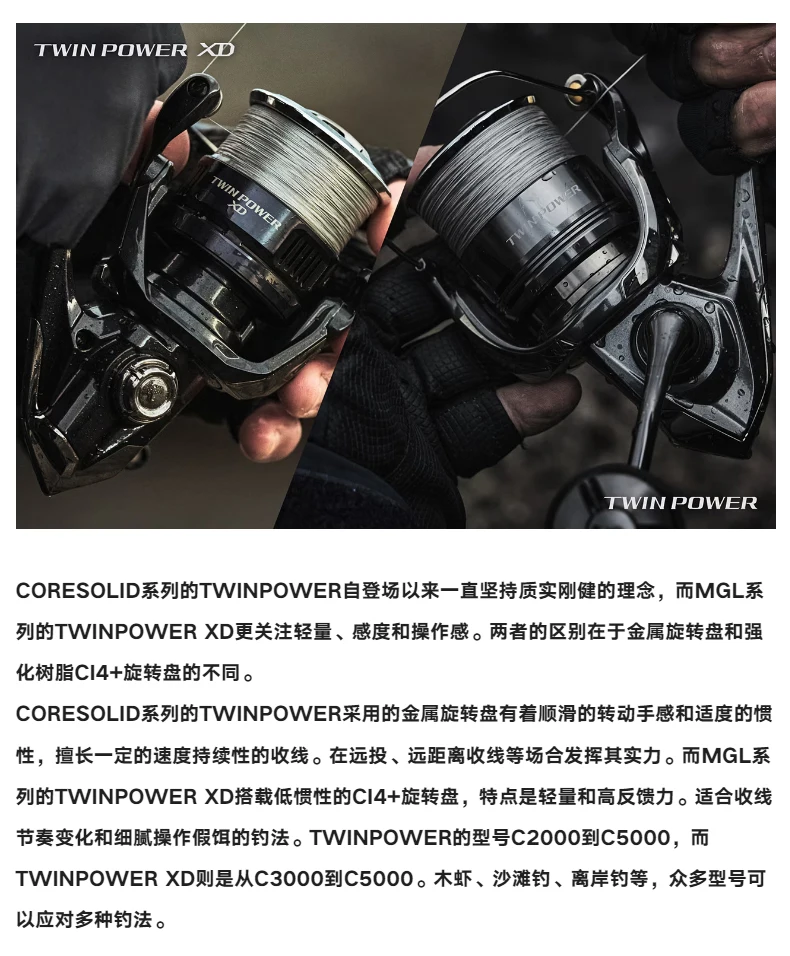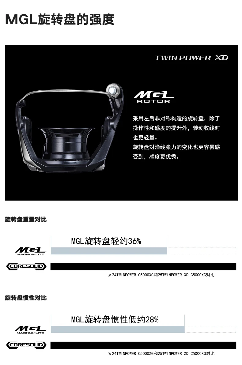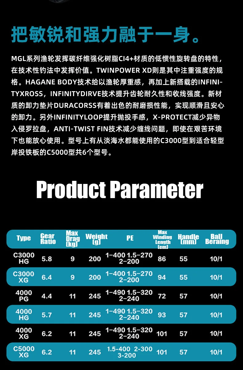 Los carretes de pesca de la serie MGL aprovechan el disco giratorio de baja inercia fabricado con resina CI4+ reforzada con fibra de carbono para mostrar su valor en la pesca técnica. TWINPOWER XD es la especificación que se centra en la fuerza. La tecnología HAGANE BODY le da al carrete de pesca una sensación de pesadez y las tecnologías INFINITYXROSS e INFINITYDIRVE recientemente instaladas mejoran la durabilidad de los engranajes y la resistencia del carrete. La nueva junta de descarga de material DURACORSS tiene una excelente resistencia al desgaste y logra una descarga suave y segura. Además, INFINITYLOOP mejora la sensación de lanzamiento, X-PROTECT reduce la intrusión de materias extrañas en el disco del rodillo y la tecnología ANTI-TWIST FIN reduce el problema de enredos, por lo que se puede usar con confianza incluso en entornos hostiles. Hay 6 modelos en total, desde el modelo C3000 que se pueden utilizar tanto en agua dulce como en agua de mar hasta el modelo C5000 adecuado para placas de hierro fundido a orilla ligera.