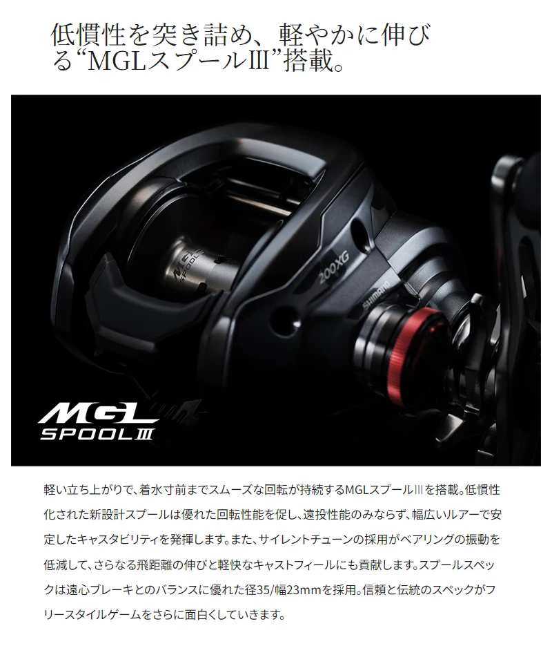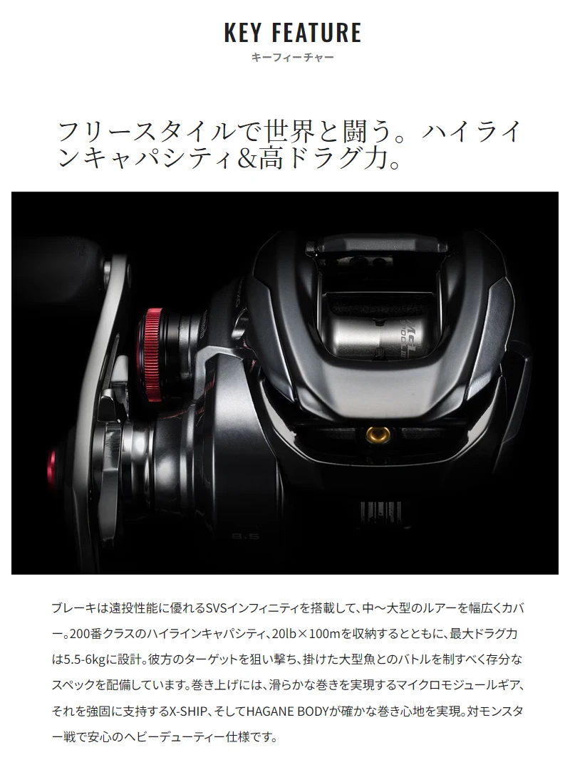 El Scorpion MD de la serie FREESTYLE también ha lanzado la especificación 200 muy anticipada.El carrete MGL de tercera generación con excelente control y rendimiento de lanzamiento está equipado con una capacidad de línea de 20 lb-100 m y una fuerza de descarga máxima de 5,5-6 kg, que corresponde a las especificaciones del producto de FREESTYLE.El sistema de frenos es SVS INFINITY, que tiene en cuenta tanto la sensación de lanzamiento como el rendimiento a larga distancia, y puede usarse para señuelos medianos a grandes.Además, el equipo MICROMODULE y X-SHIP brindan una sensación de carrete suave, mientras que el cuerpo HAGANE proporciona fuerza, lo que le permite pescar con tranquilidad incluso cuando lucha contra peces grandes.
