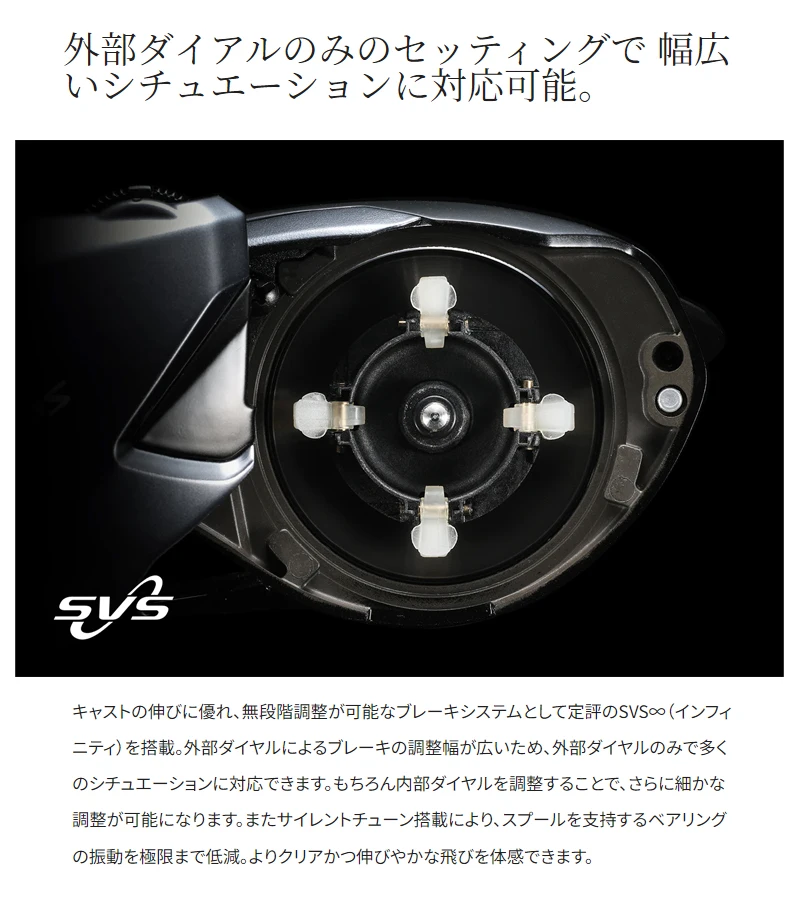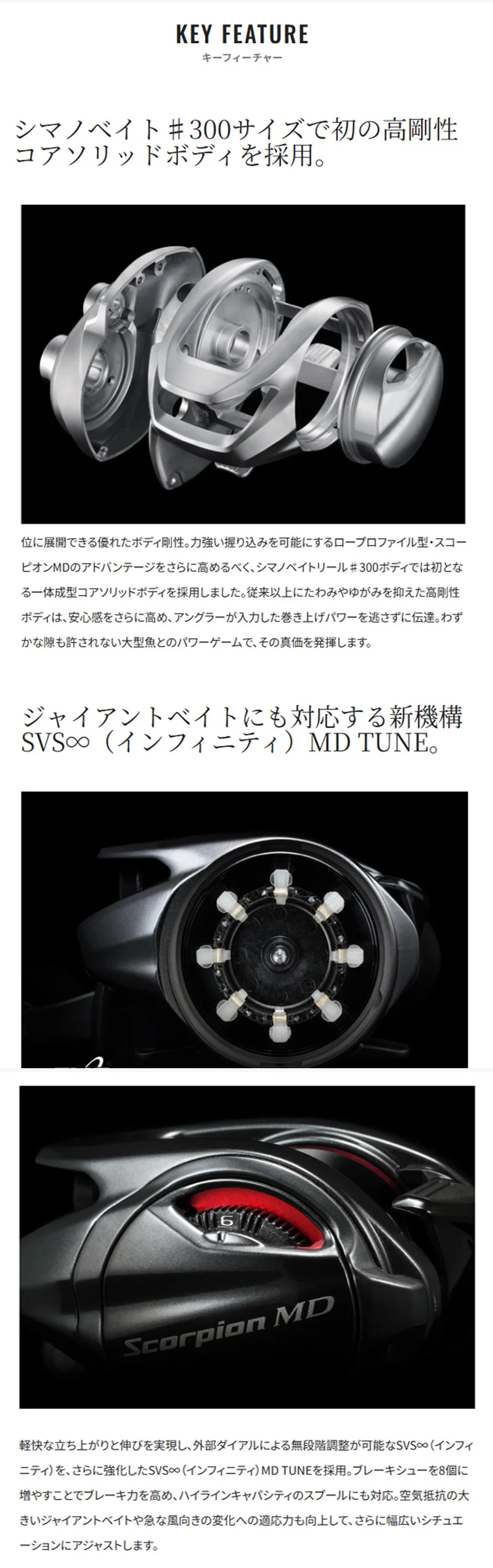 Scorpion MD, que puede manejar todo tipo de peces grandes, desde lubina negra hasta flomo, ha evolucionado para ser más fuerte y más fácil de operar. En la pesca de peces grandes, el cuerpo debe ser lo suficientemente rígido como para enfrentar peces grandes de frente. El nuevo Scorpion MD adopta CORESOLID BODY por primera vez en el modelo 300. La alta rigidez lo hace resistente al fuerte enrollamiento del hilo y suprime la distorsión corporal, lo cual es muy útil en la pesca de peces grandes. El sistema de frenos adopta el nuevo SVS INFINITY MD TUNE, que puede ajustar la fuerza de frenado desde el dial externo, y 8 granos de freno garantizan una alta fuerza de frenado. Puede manejar señuelos grandes con gran resistencia al aire y cambios bruscos en la dirección del viento. Heredando la antigua tecnología MICROMODULE GEAR y X-SHIP, tiene una alta capacidad de línea y una alta fuerza de descarga. FREESTYLE, que está ganando popularidad, te invita a desafiar peces grandes.