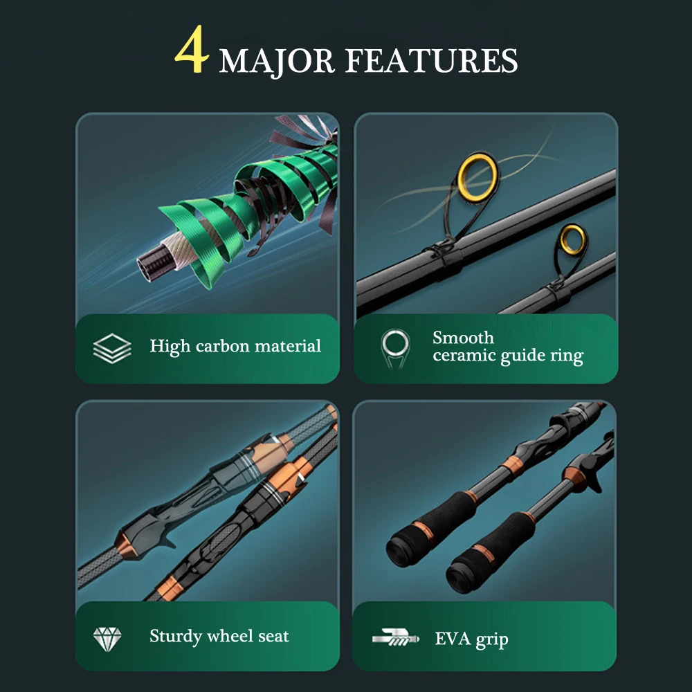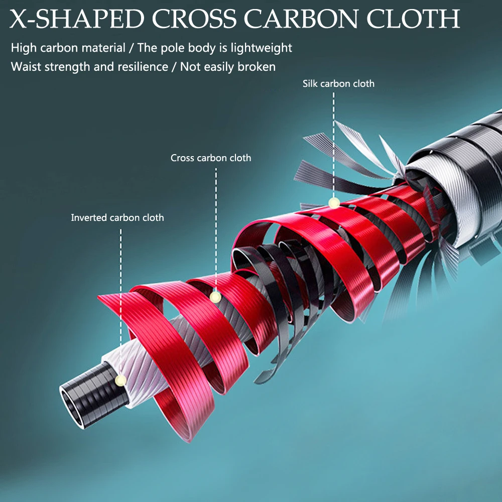 1. Esta caña de pescar está hecha de fibra de carbono, fuerte y duradera.