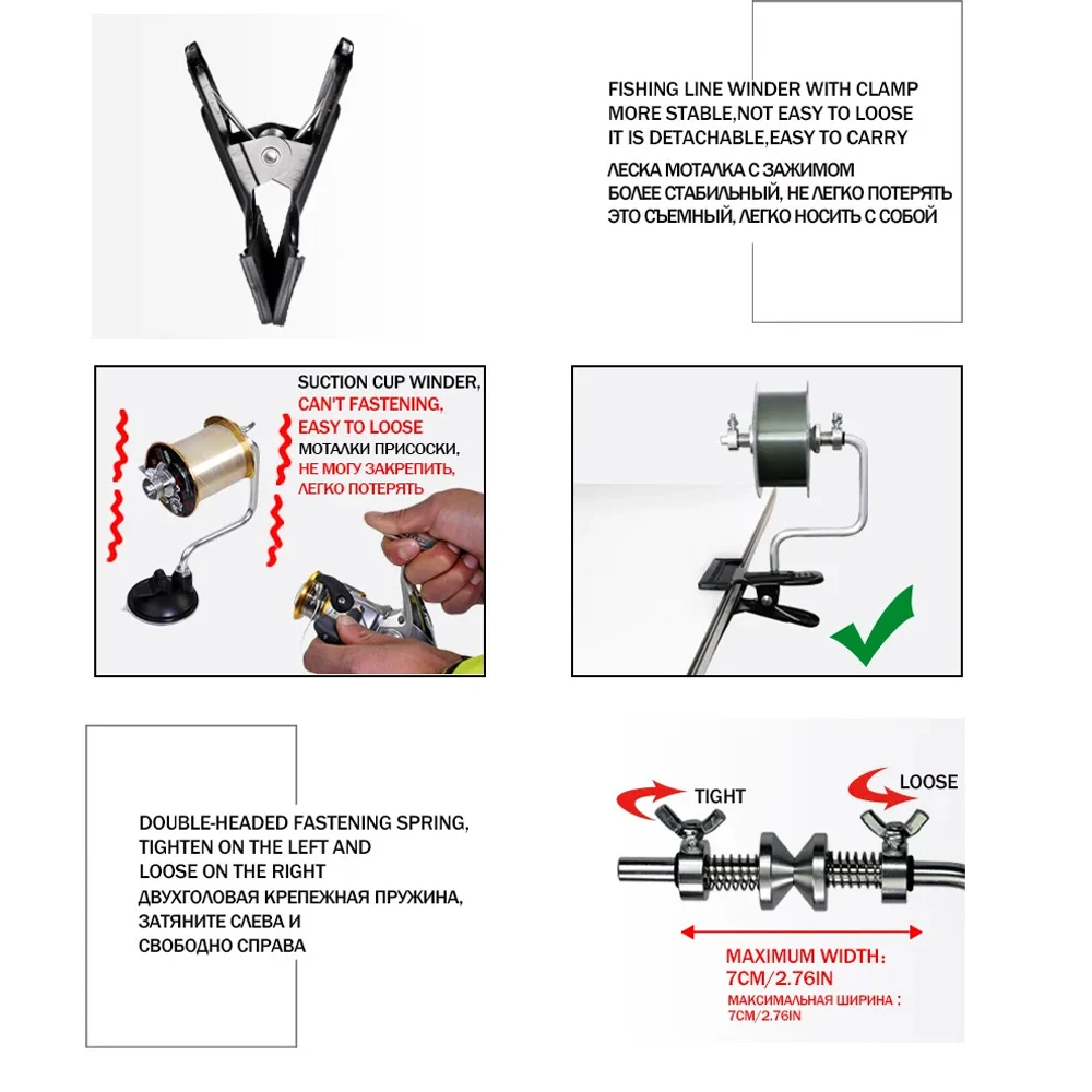 1. Abrazadera potente y desmontable: enrollador de hilo de pescar de aluminio con abrazadera de goma.La alfombrilla antideslizante incorporada y la superficie rugosa le permiten sujetarse firmemente a casi cualquier superficie.Fácil de quitar e instalar, sólido y portátil para almacenamiento.