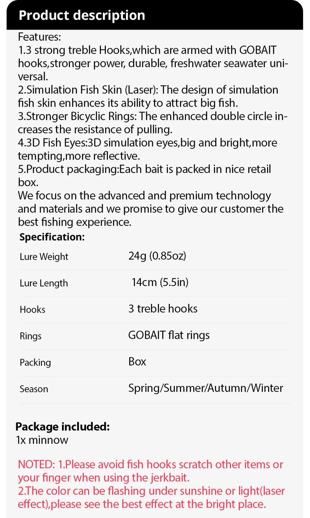 Aviso: 1. Evite que los anzuelos rayen otros artículos o el dedo cuando use el jerkbait