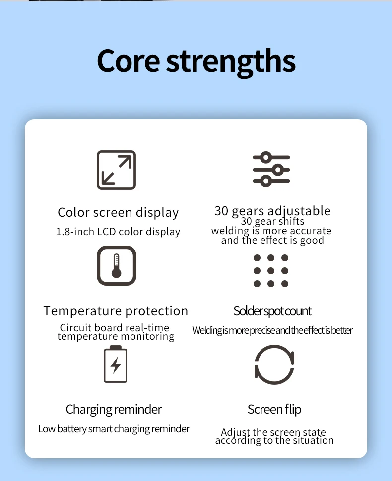 5. Función de material/AUTOINSPECCIÓN: hecho de ABS y PCB de alta calidad, tiene una durabilidad extremadamente alta y un rendimiento estable, y tiene una larga vida útil. Gestión de Energía Avanzada y diseño de software, sin reinicio y cero retorno durante la soldadura. Cuando la pluma de soldadura toca la placa de níquel, la función de autocomprobación se activa automáticamente y el tiempo de respuesta es de 0,8 S.