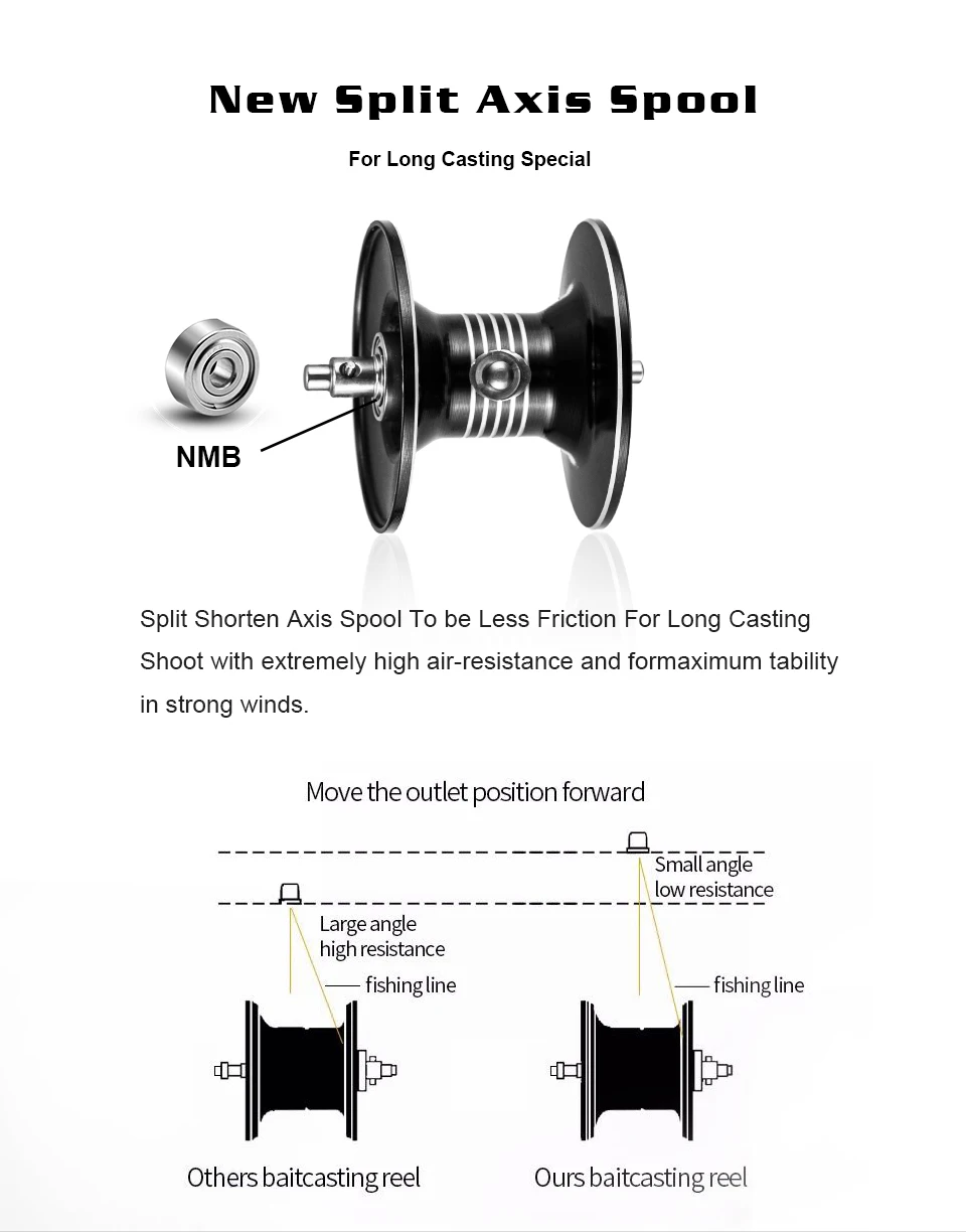 2. Por Primera vez usando, por favor ajuste la fuerza de frenado a un máximo de 5 lvet para evitar la reacción de la línea de pesca Luego Ajuste gradualmente el nivel de acuerdo con el peso del cebo para lograr la distancia de lanzamiento más lejana