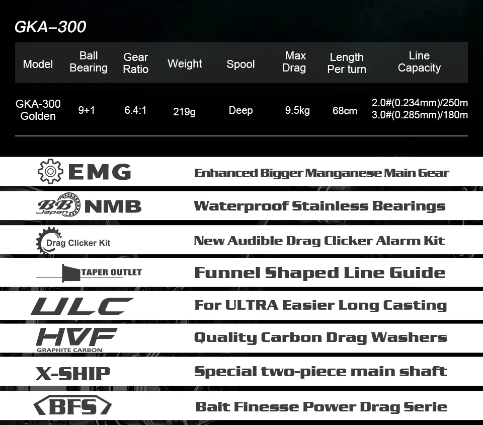 • 9,5 kg arrastre:El carrete puede soportar cargas pesadas, por lo que es perfecto para la captura de peces grandes.