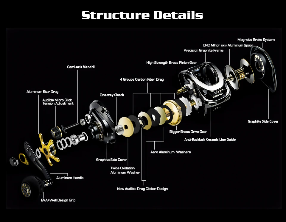 2. Por Primera vez usando, por favor ajuste la fuerza de frenado a un máximo de 5 lvet para evitar la reacción de la línea de pesca Luego Ajuste gradualmente el nivel de acuerdo con el peso del cebo para lograr la distancia de lanzamiento más lejana
