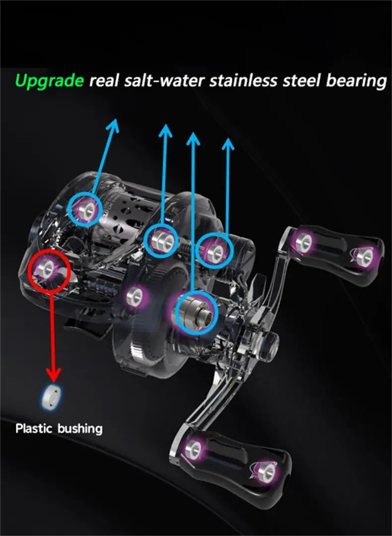 3. Rendimiento ultra suave: ¡la reacción se reduce definitivamente! Los rodamientos de acero inoxidable blindados reales 11 + 1 (incluyendo 2 rodamientos NMB), proporcionan una recuperación ultra suave, junto con una buena lubricación, hemos actualizado a 8 cuentas magnéticas y aumentamos el 20% de las superficies de contacto del carrete, el sedal no se difuminará y puede ahorrar muchos problemas y más tiempo para pescar. Antes de llevar el al mercado, lo hemos probado durante mucho tiempo, use un señuelo de metal de 3,5g, puede ser lanzado 30-50 metros incluso por un pescador de mano verde.