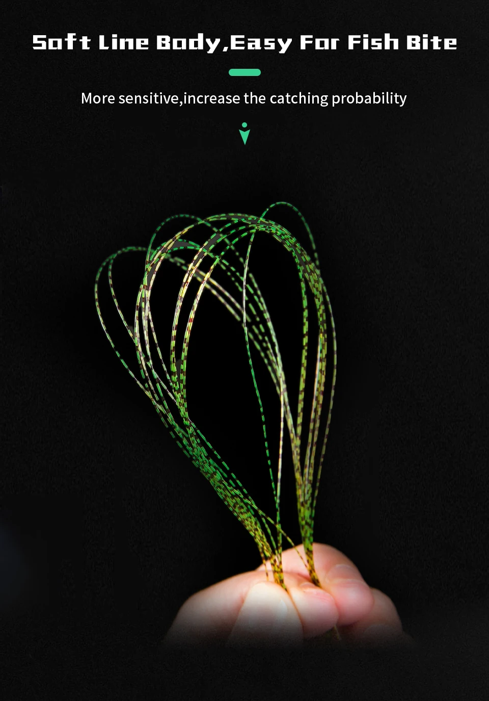Resistencia superior a la abrasión, la superficie del monofilamento de fluorocarbono es más dura, lo que la hace sustancialmente más resistente a la abrasión. Más fuerte, más suave, más flexible para una fácil fundición.