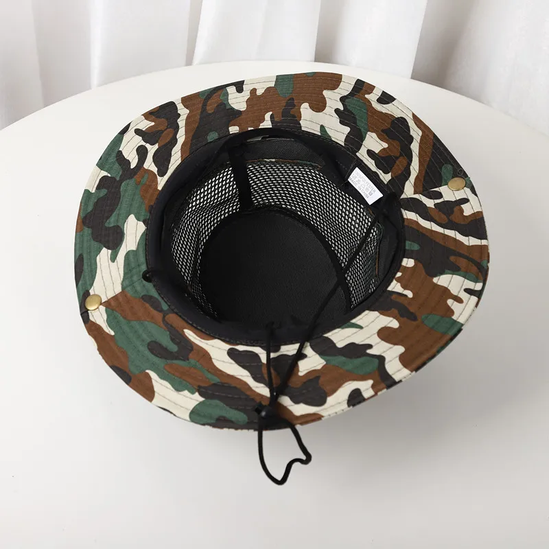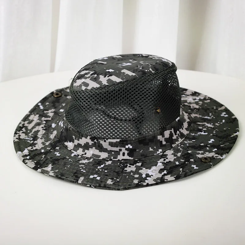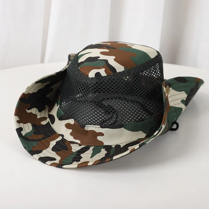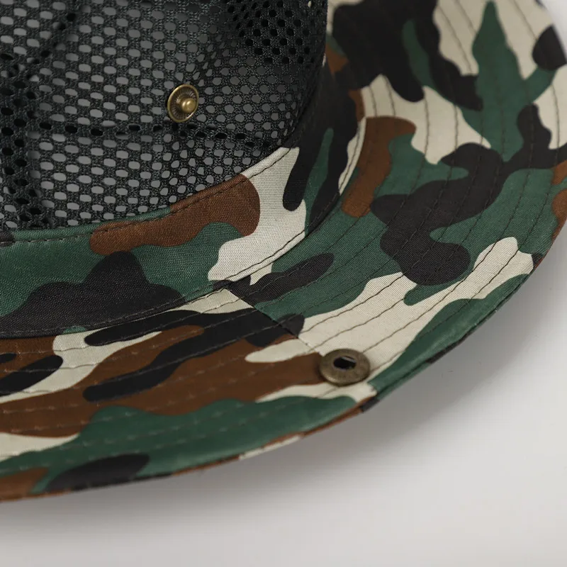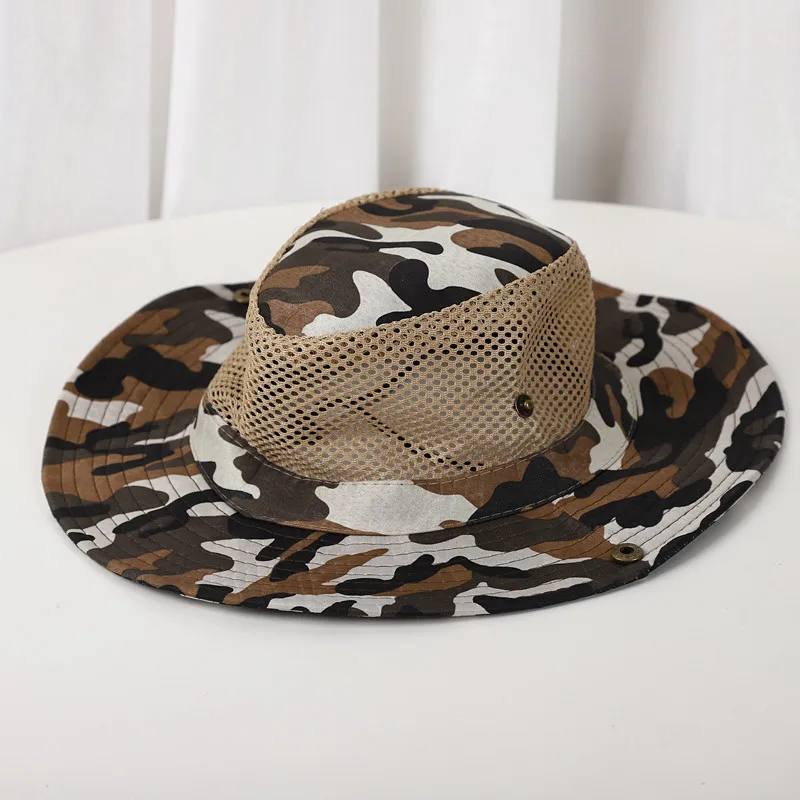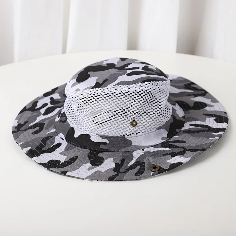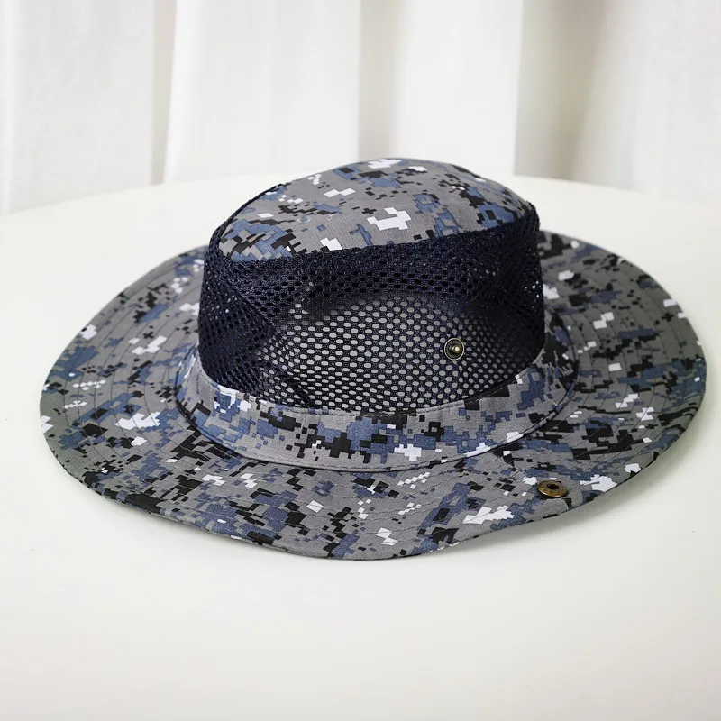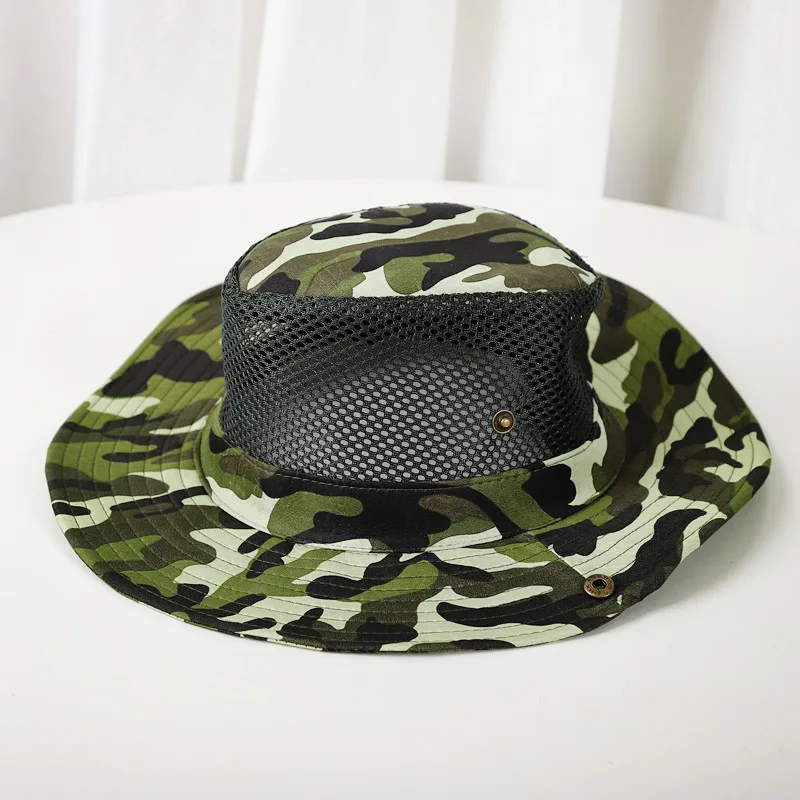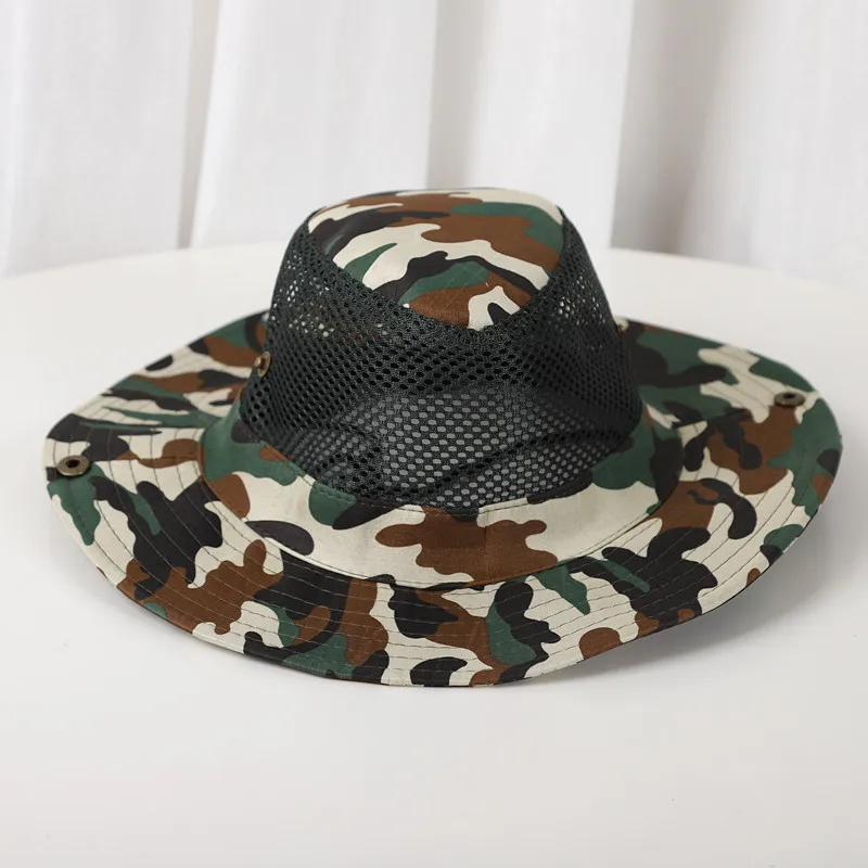 Sombrero de ala ancha con protección solar para hombre, gorra de red de camuflaje para pesca, sombreros de verano, sombrilla de pescador y caza